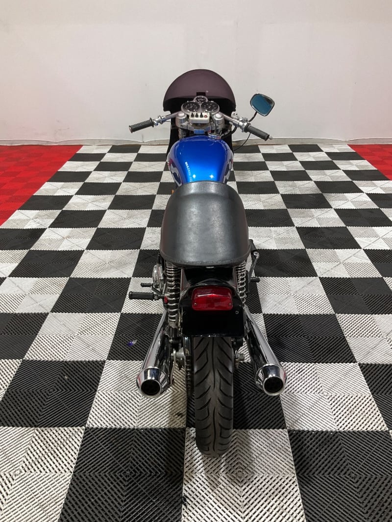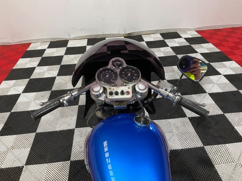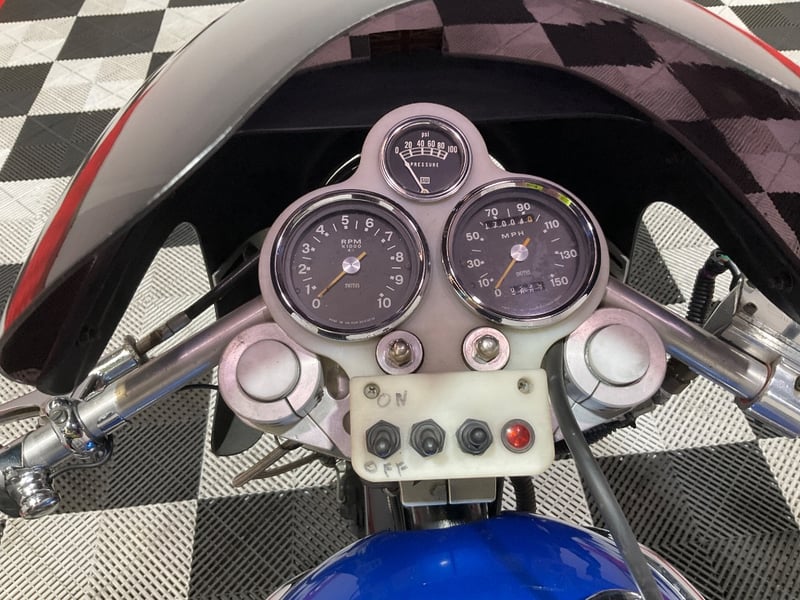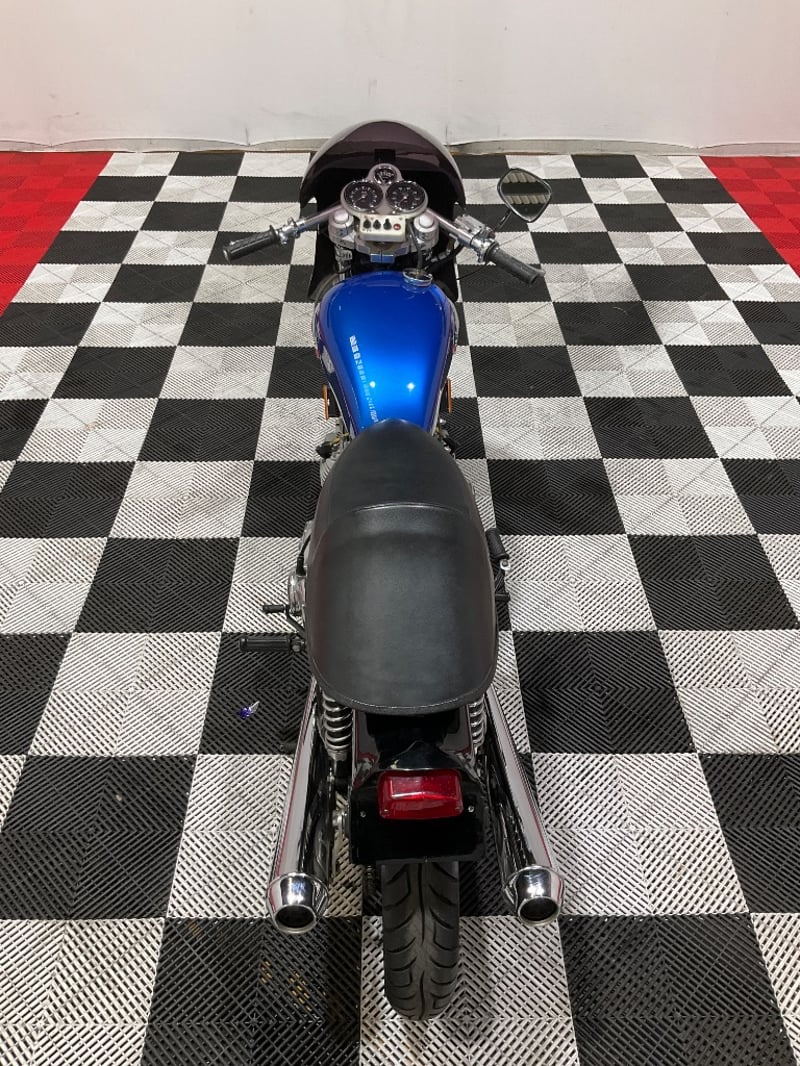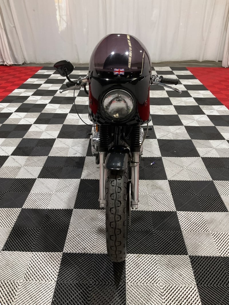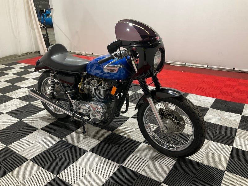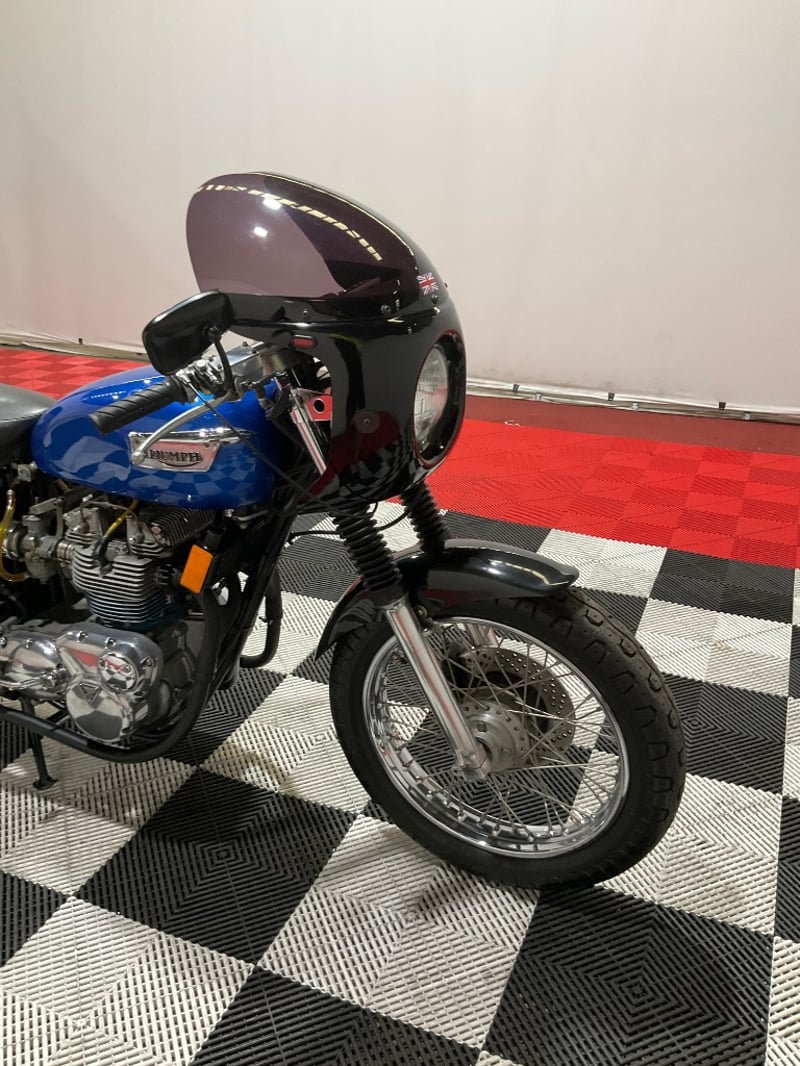 1973 Triumph Trident T150V Very few bikes can lay claim to being a genuine piece of British motorcycle racing history, but the Triumph Trident is absolutely one of them. The T150 triple dominated production racing in the early 1970s, including a famous one-two-three finish at the 1971 Isle of Man Production TT, and the street versions carried all of that three-cylinder character into something you could actually ride every day. The T150V here is the desirable 5-speed variant, the most refined of the series, and someone has done a proper job turning it into a cafe racer. The modifications are well-executed and show real knowledge of what works. The bikini fairing keeps the lines clean and houses the original Smiths tachometer and speedometer, with an added oil pressure gauge in a tidy three-instrument cluster. Billet alloy triple clamps replace the originals. The front end has been upgraded with Lockheed brake calipers and a drilled disc rotor for improved stopping power. The seat is a neat single cafe hump in good-condition black vinyl. A chrome 3-into-2 exhaust with megaphone silencers finishes the rear end properly. The Union Jack stickers on the fairing and the 'TRIDENT' side panels with 'Ton' marking leave you in no doubt what this machine is about. The metallic blue tank paint is a standout, deep and glossy with the chrome Triumph badge sitting cleanly on it. The polished primary and timing covers are near mirror-finish. All three Amal Concentric carbs are present and correct. The rear tyre appears to be a modern replacement with good tread. The Smiths gauges show approximately 17,000 miles, which is reasonable for a well-maintained triple that has seen some actual use. This is a proper, thoughtfully built example of one of Britain's most revered classics. Not a trailer queen, not a rough project, but a purposeful cafe machine that is ready to ride or show. Key #F23