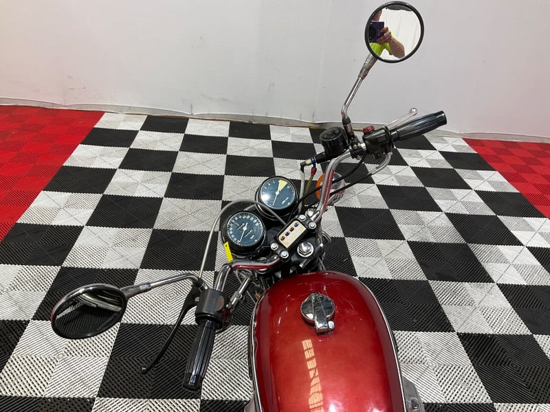 This 1975 K5 is one of the later evolutions of the original CB750 series, still carrying the classic SOHC inline four and that glorious four-into-four exhaust before Honda moved to the later designs. It is finished in Candy Antares Red with the K5's distinctive black centre stripe flanked by gold pinstripes, and if you know your CB750s you will recognise the livery immediately. The paint is original and unrestored. For nearly 50-year-old candy red, it is holding up remarkably well: the gloss and depth are still there, the stripe graphics are clean, and there are no major chips or repairs visible anywhere.
