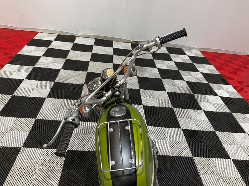 This example is finished in the correct original olive-green metallic with the distinctive cream and gold tank stripe. The paint is what it is after 55 years on the planet: the tank body retains reasonable gloss and the colour is rich and correct, but the stripe has chips and flaking consistent with its age and unrestored status. This is patina you earn, not patina someone faked with a wire brush. The chrome tells the same story: surface pitting on the headlight bucket, turn signals and instrument bezels, while the exhaust pipes and wheel rims have held up better than you would expect.