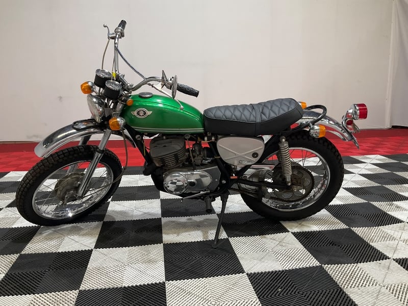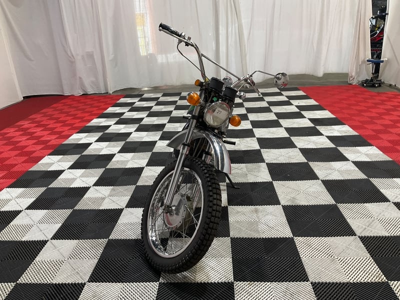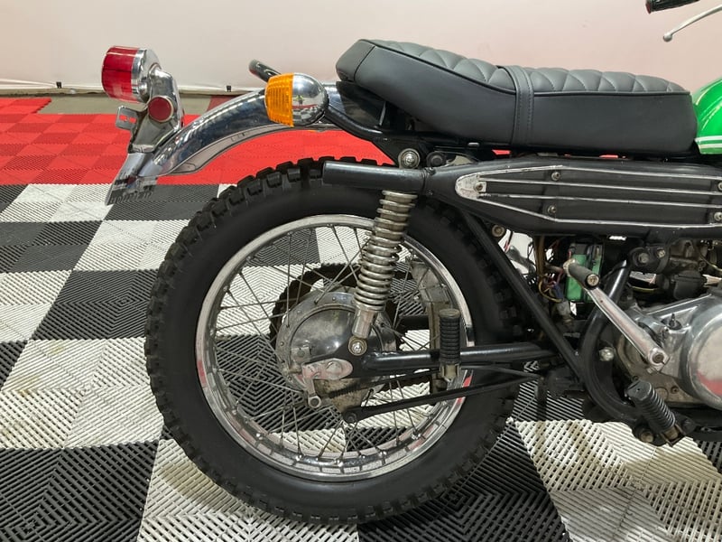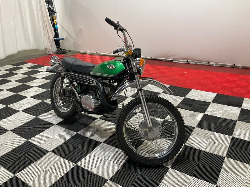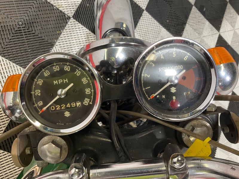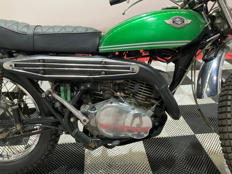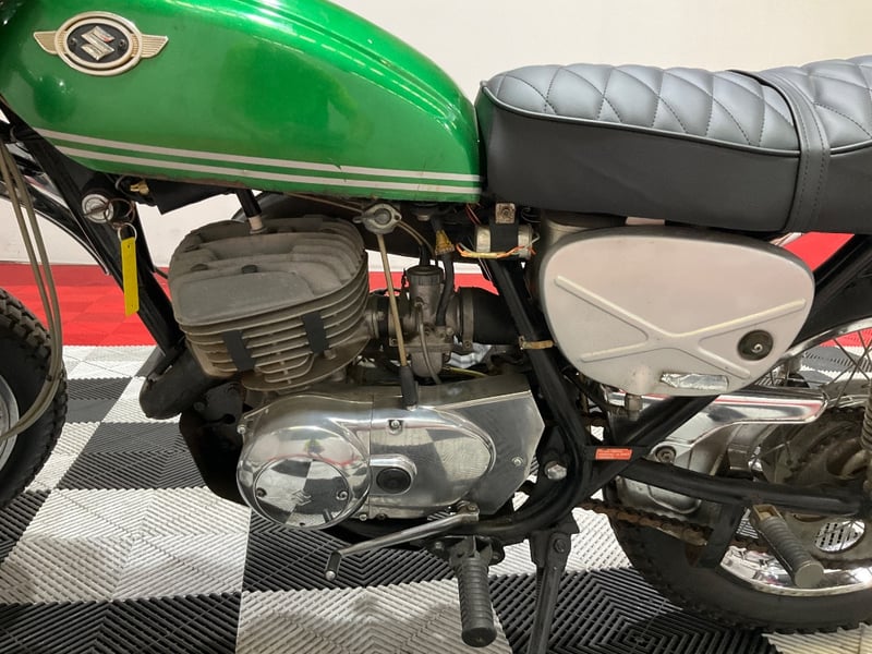 This example presents in striking metallic green with the original white pinstripes intact and glossy. The chrome is bright across the front fender, rear fender, and shock absorbers. The twin Nippon Seiki gauges have been photographed close-up and clearly show 2,249 miles on the odometer, which is extraordinary for a 55-year-old trail bike. The engine cases are nicely polished, the winged Suzuki tank badge is original and correct, and the seat has been re-covered in diamond-quilted black vinyl that looks fresh. The upswept scrambler-style exhaust is all there, mounted and intact.