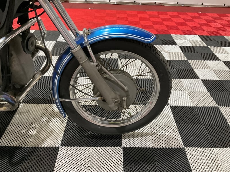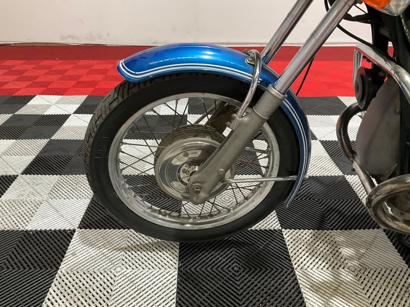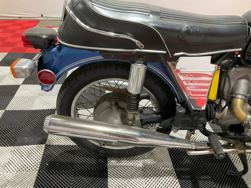 This 1972 example presents very well in its two-tone livery. The iconic long-style toaster tank wears its original black and silver panels with the BMW roundels looking crisp on each side, matched by blue metallic fenders with white pinstriping. The chrome louvered side covers are present and correct, the mufflers are the proper cigar-style units with expected golden heat patina, and the wire-spoke wheels are straight and true with good tyre tread all round.