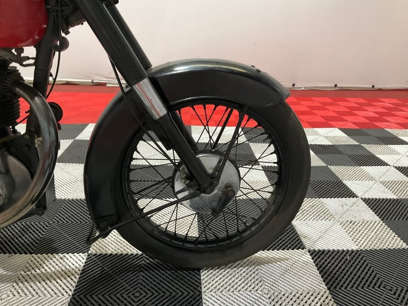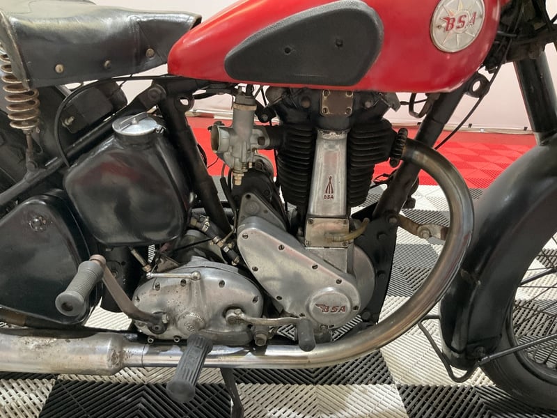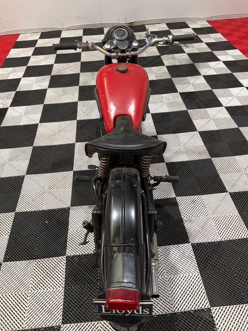 The bike presents in honest, complete condition. The red tank carries both original BSA roundel badges with the classic piled-rifles emblem and the paint, while showing age, is presentable. The iron barrel and alloy head show the expected patina of a bike that has actually been run. The exposed plunger springs either side of the rear wheel give the bike that perfect mid-50s silhouette that makes BSA singles of this era so photogenic. The solo sprung saddle is the correct period fitment.