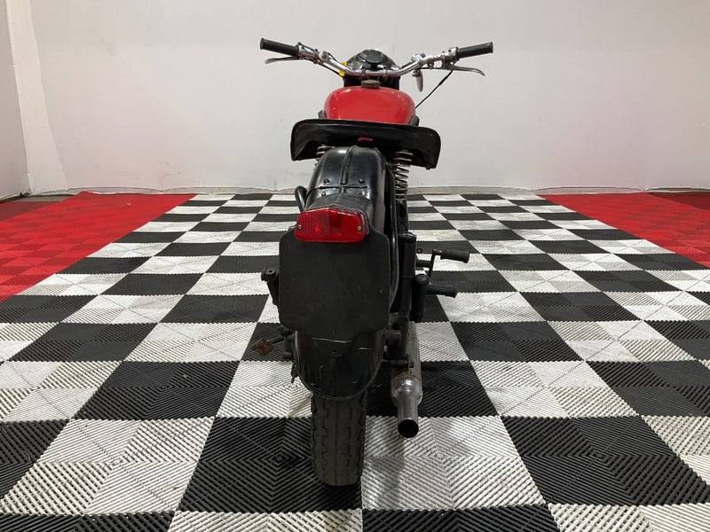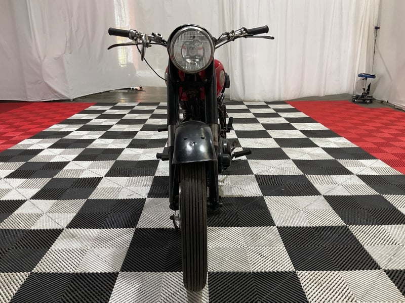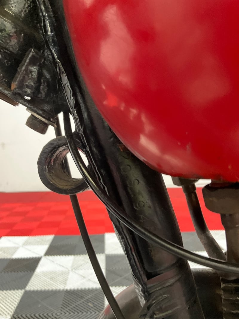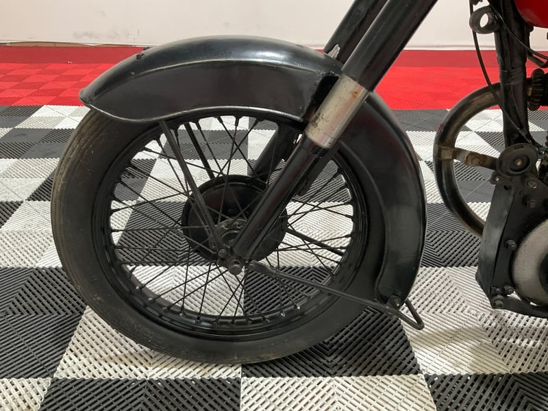 Under the red-and-black bodywork sits a 500cc OHV single-cylinder four-stroke, air-cooled, with a separate four-speed gearbox and chain drive. The engine is fitted with an Amal Monobloc carburettor described by the vendor as virtually brand new. Mechanical notes are refreshingly detailed: approximately 110 psi compression with a good spark, valve lifter functioning, advance and retard working, gears and brakes operational. The clutch slips slightly and will likely need the plates cleaned or replaced, an honest disclosure that any buyer will appreciate and a straightforward job for a competent mechanic.