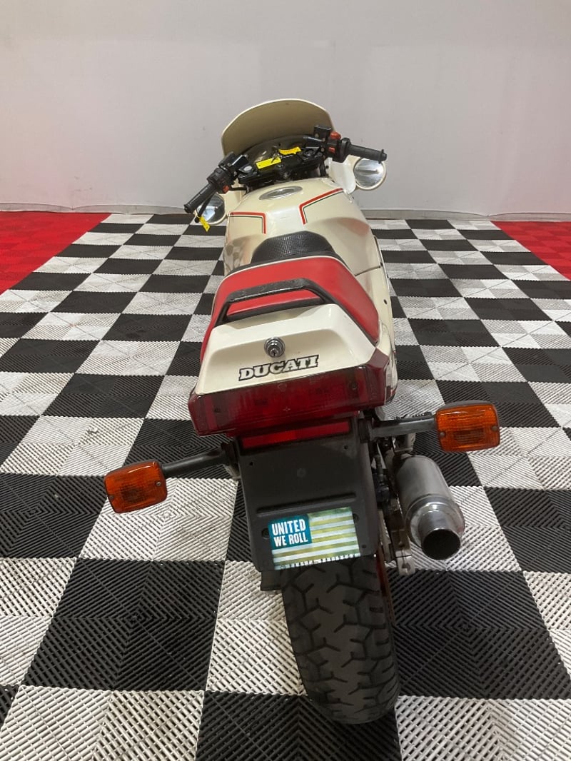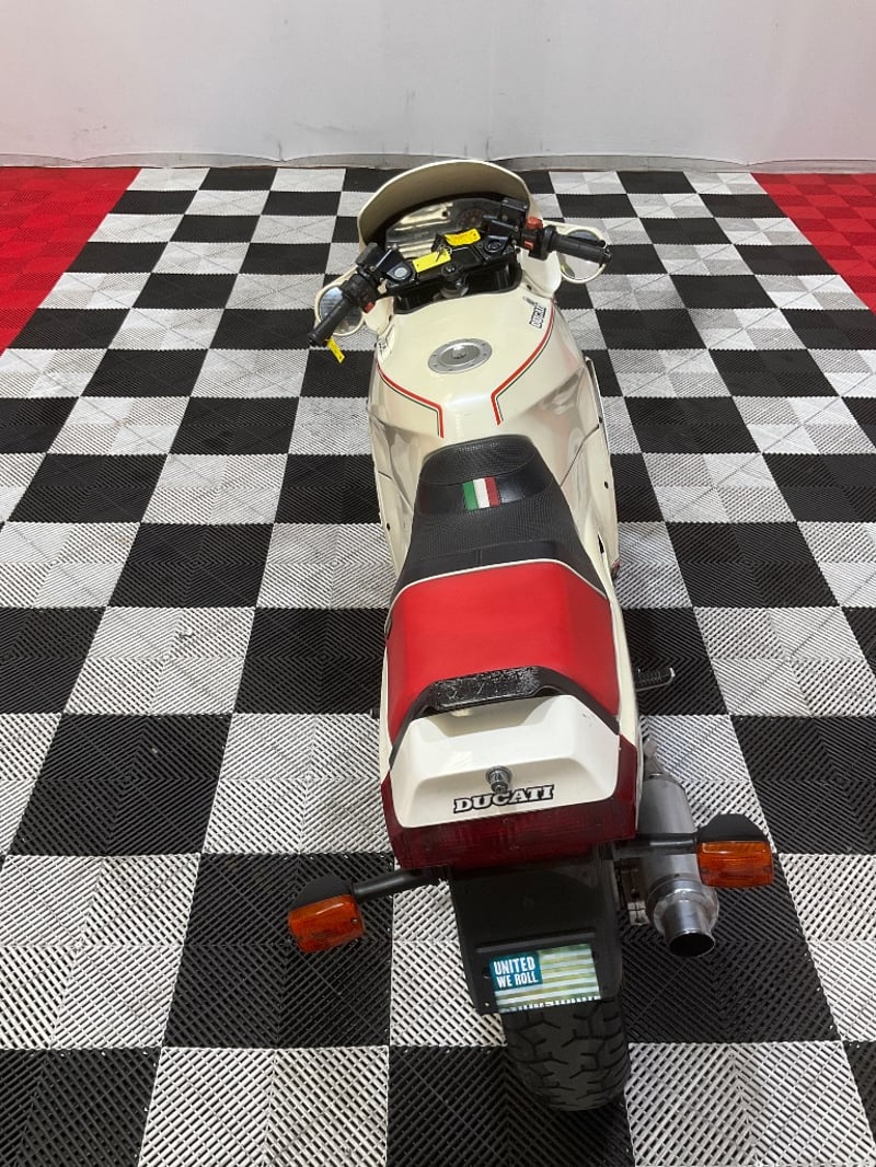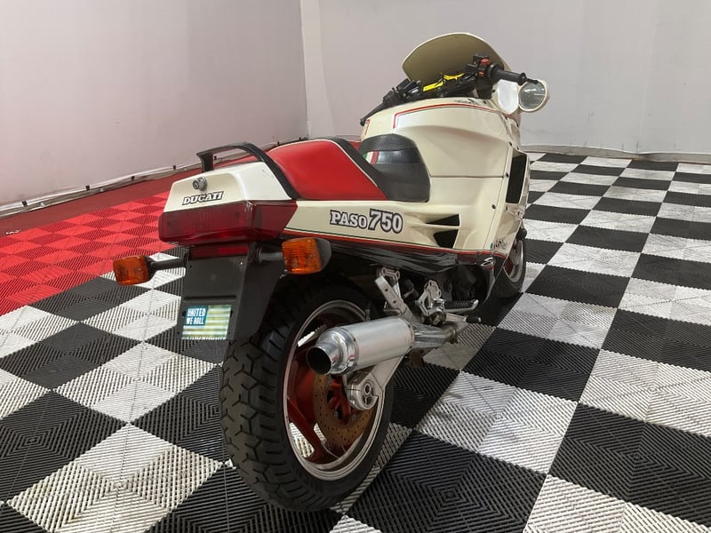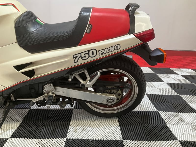 The 750 Paso is one of those bikes that stops you in your tracks. Designed by Massimo Tamburini before he went on to create the 916, the Paso was Ducati's bold attempt at a fully-faired sports machine when it arrived in 1986, and it landed like a spaceship in a world of naked bikes. Named after Italian racing legend Renzo Paso Pasolini, these were genuinely revolutionary. And this one is the rare bit: a white Limited edition, which the vendor advises is one of approximately 100 produced in this colour. The photos back that up with the correct Italian tricolore pinstriping, red three-spoke Oscam-style wheels, Limited decals on both sides, and the Italian flag details on the Corbin seat that mark this as a genuine Limited example.