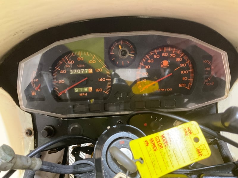 Bodywork is solid for a 37-year-old bike. Some yellowing of the white paint is unavoidable from this era, minor scuffs are present on the lower fairings, and the drilled brake discs show surface oxidation from sitting. The red anodized wheel finish has some fading on the front. The instrument lens has minor internal clouding. No crash damage, no significant dents, no visible oil leaks. VIN ZDM1DA3N6JB754097 is stamped into the steering head and visible in photos.