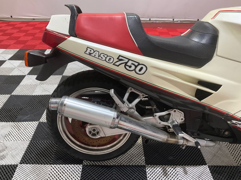 Mechanically the Paso runs Ducati's 750cc Desmodromic L-twin. The 6-speed gearbox and chain drive are present. The Weber dual-throat downdraft carburettor setup is fitted as correct. The exhaust is an aftermarket aluminium slip-on silencer in clean condition, not the original Conti unit referenced in the description, but actually a sensible upgrade for breathing. The Corbin seat replaces the original Ducati item but is in good nick.