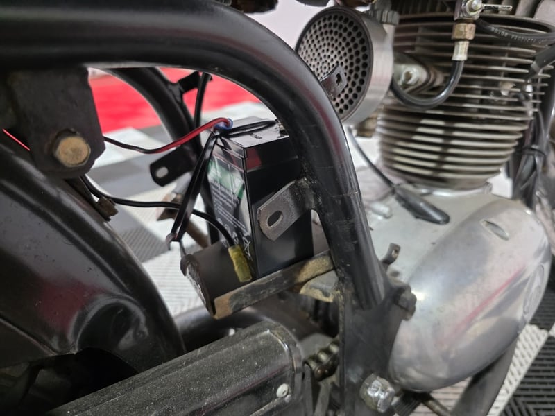 Be honest with yourself about the work it needs though. The seat cover is in poor shape, with extensive tearing, cracking, and tape repairs throughout. It needs a full reupholster before this bike looks the part. The tank white paint has chipped at the edges with some bare metal and light surface rust visible near the rear. Both tyres are aged and should be replaced before any road use regardless of tread depth. The headlight shell has minor surface rust around the key slot.