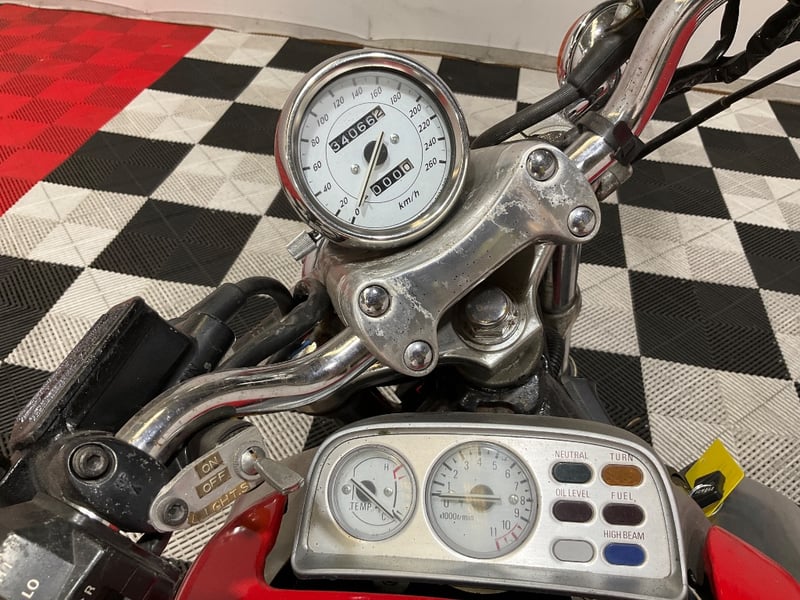 An iconic muscle bike from the 1980s, this 1986 Yamaha V-Max 1200 is finished in Red and shows an indicated 34,066 kilometres. Famous for its aggressive styling and explosive acceleration, the V-Max quickly became one of the most legendary performance motorcycles of its era.