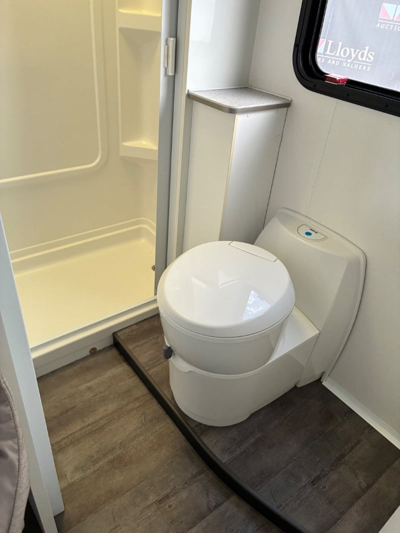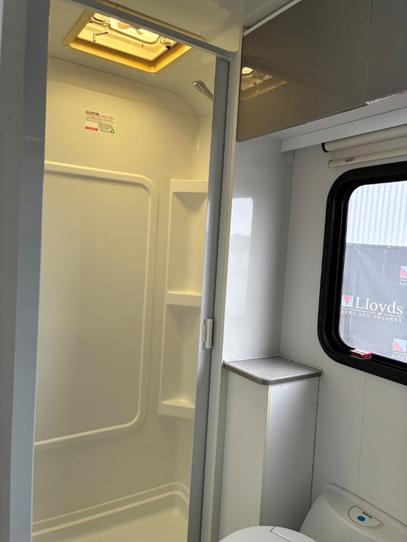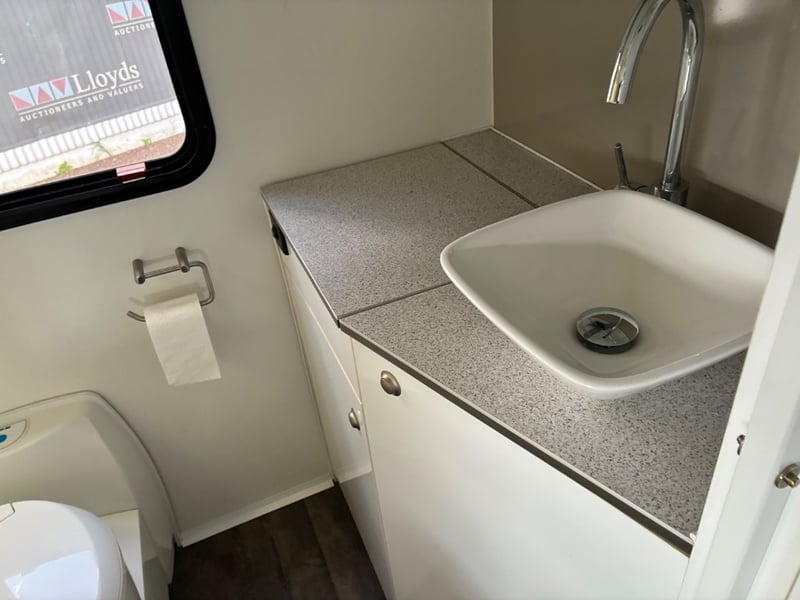 The rear living area is fully self-contained and configured to sleep up to four occupants, offering a functional layout with a kitchenette, bathroom facilities and generous storage. Key amenities include a gas cooktop, sink, refrigerator, television and climate control system, along with a separate shower cubicle and toilet for convenient self-contained accommodation.