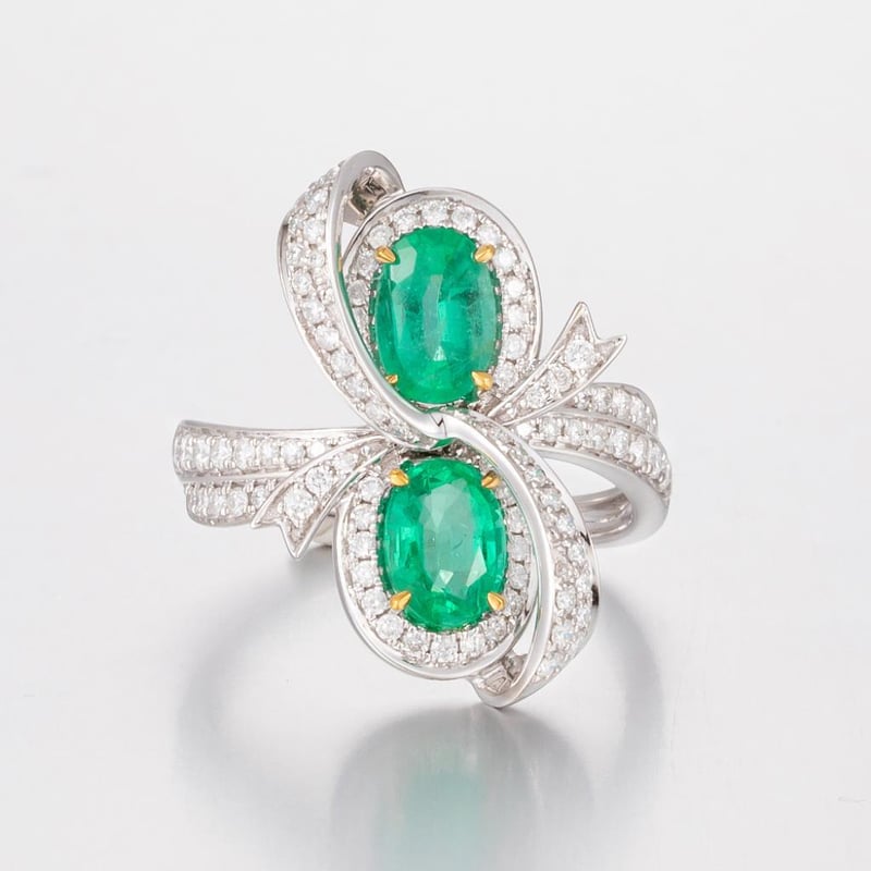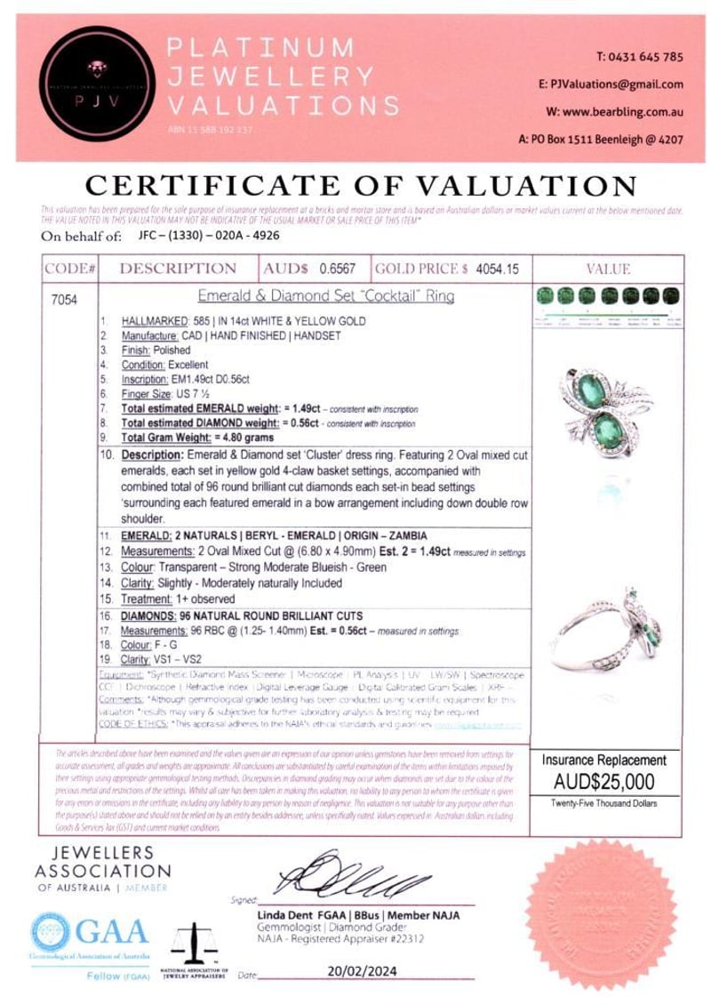 Featuring Centre, 2 Oval Cut, Strong Moderate Bluish-Green Zambian Emeralds (1.49Ct Tsw, Slightly-Moderately Included), Claw Set In Yellow Gold, With 96 Round Brilliant Cut Diamonds (0.56Ct Tdw, F-G Colour, Vs1-Vs2 Clarity), Bead Set. Ring Size O.