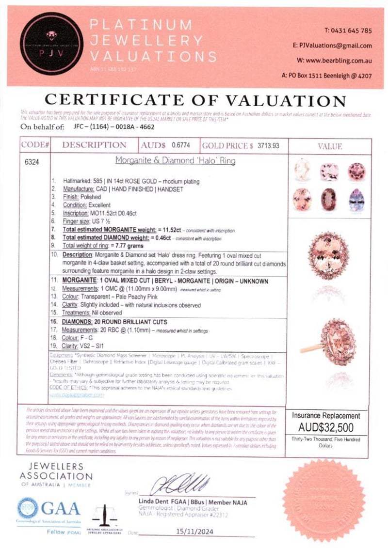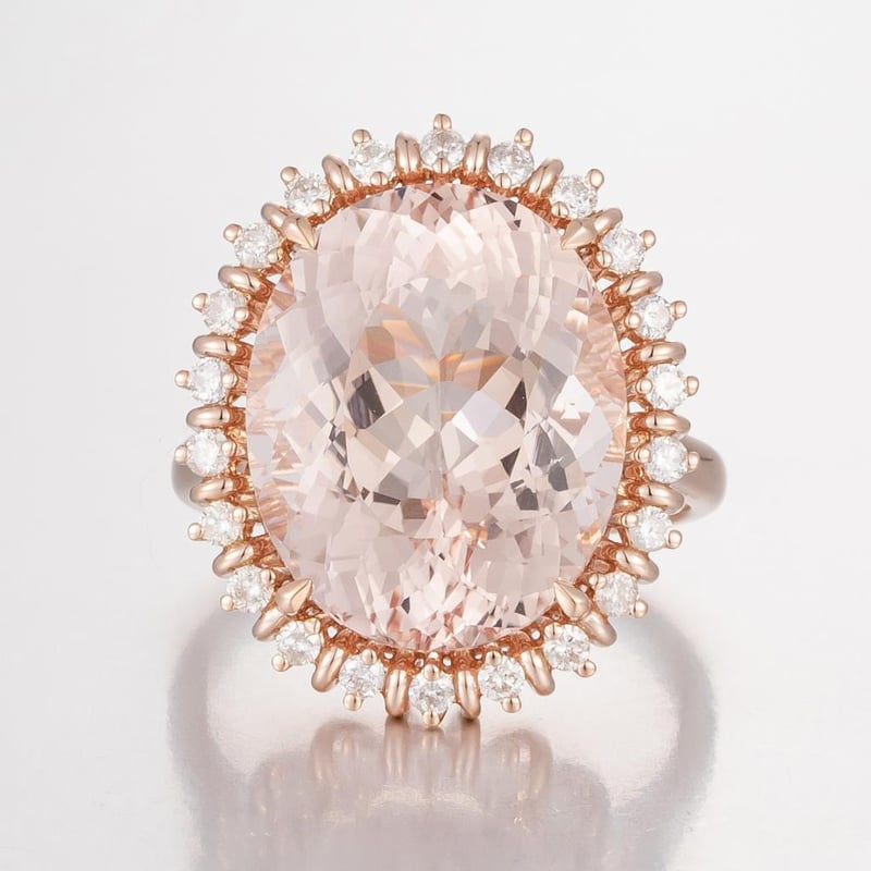 Featuring Centre, One Oval Cut, Pale Peachy Pink Morganite (11.52Ct, Slightly Included), Claw Set, With 24 Round Brilliant Cut Diamonds (0.46Ct Tdw, F-G Colour, Vs2-Si1 Clarity), Claw Set. Ring Size O.