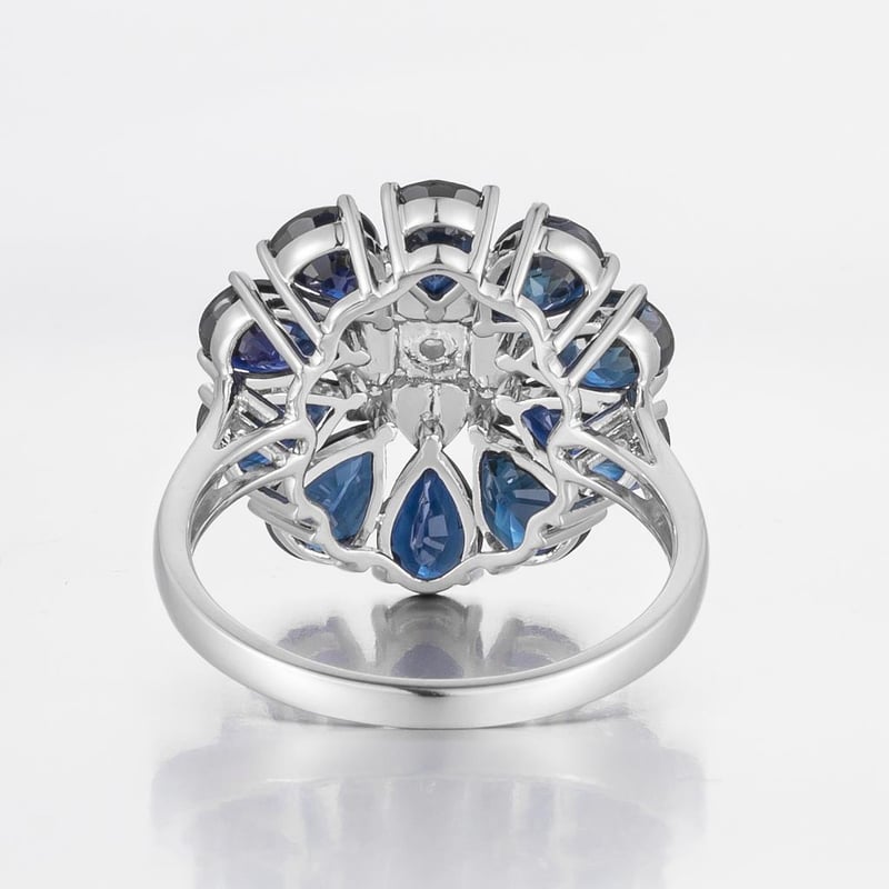 Featuring Centre, 13 Round Brilliant Cut Diamonds (0.12Ct Tdw, G-H Colour, Si1-Si2 Clarity), Bead Set, With 10 Pear Cut, Dark Royal Blue Australian Sapphires (5.29Ct Tsw, Moderate-Heavy Inclusions), Claw Set. Ring Size O.