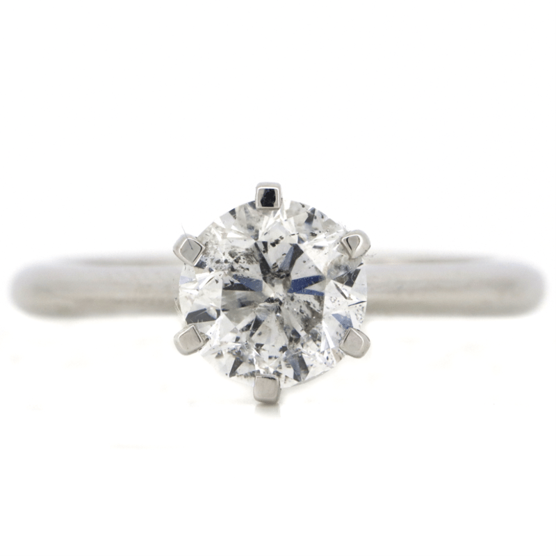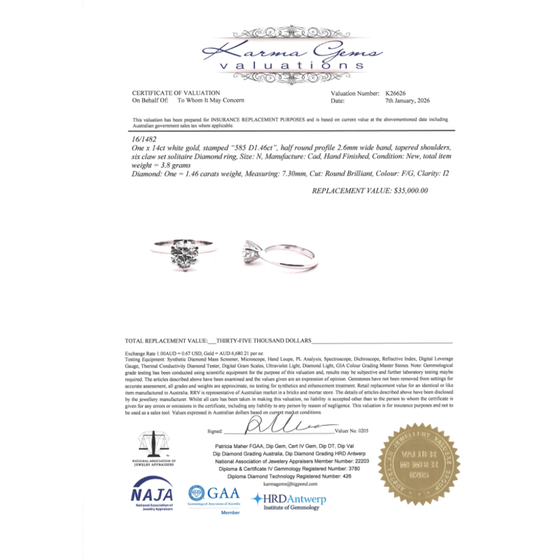 The Centre Features, One Round Brilliant Cut, Diamond (1.46Ct, F-G Colour, I2 Clarity), 6 Claw Set. Ring Size N.