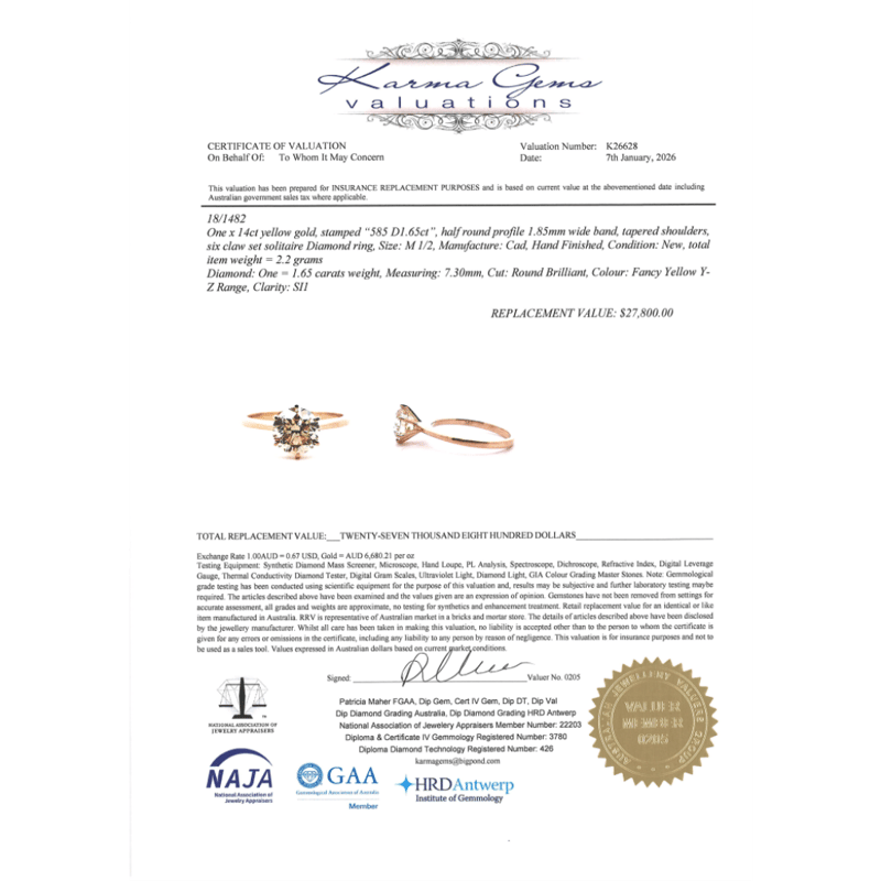 The Centre Features, One Round Brilliant Cut, Diamond (1.65Ct, Fancy Yellow/Y-Z Colour, Si1 Clarity), 6 Claw Set. Ring Size M 1/2.