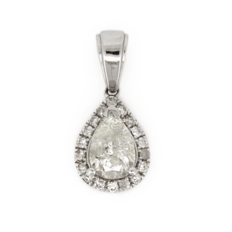 The Centre Features, One Pear Cut, Diamond (0.82Ct, H-I Colour, P2 Clarity), Claw Set. Surrounding The Centre In A Halo Are, 18 Round Brilliant Cut, Diamonds, (0.21Ct Tdw, H-I Colour, P2 Clarity), Claw Set.