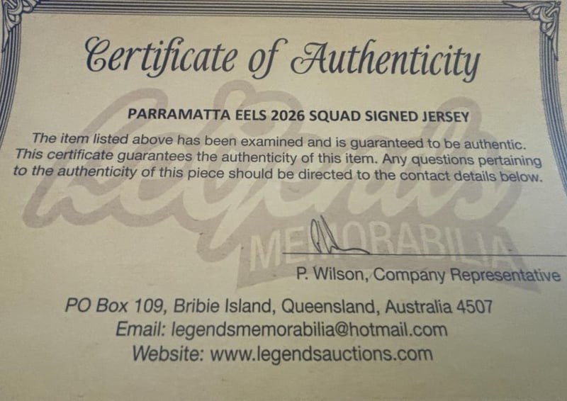 PARRAMATTA EELS 2026 SQUAD SIGNED JERSEYParramatta Eels 2026 Squad Signed Jersey. The Jersey Is Size L. The Item Is Accompanied By A Certificate Of Authenticity. Condition: Good - Refer To Images584560+3