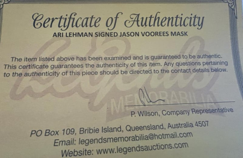 Friday The 13Th Jason Voorees Mask Personally Signed (With Inscriptions) By The First Jason, Ari Lehamnthe Item Is Accompanied By A Certificate Of Authenticity.