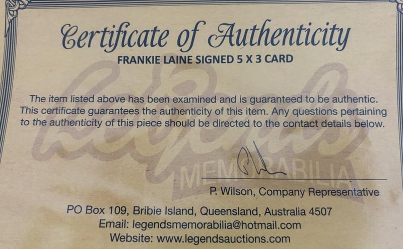 FRANKIE LAINE SIGNED PIECEFrankie Laine (D 2007) Personally Signed Card With 8 X 10 Photo. The Item Is Accompanied By A Certificate Of Authenticity. Condition: Good - Refer To Images584560+37