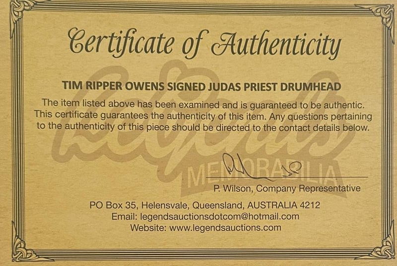 Judas Priest 12 Inch Drumskin Personally Signed By Lead Singer Tim Ripper Owens. The Item Is Accompanied By A Certificate Of Authenticity.