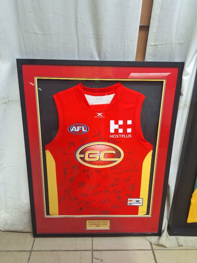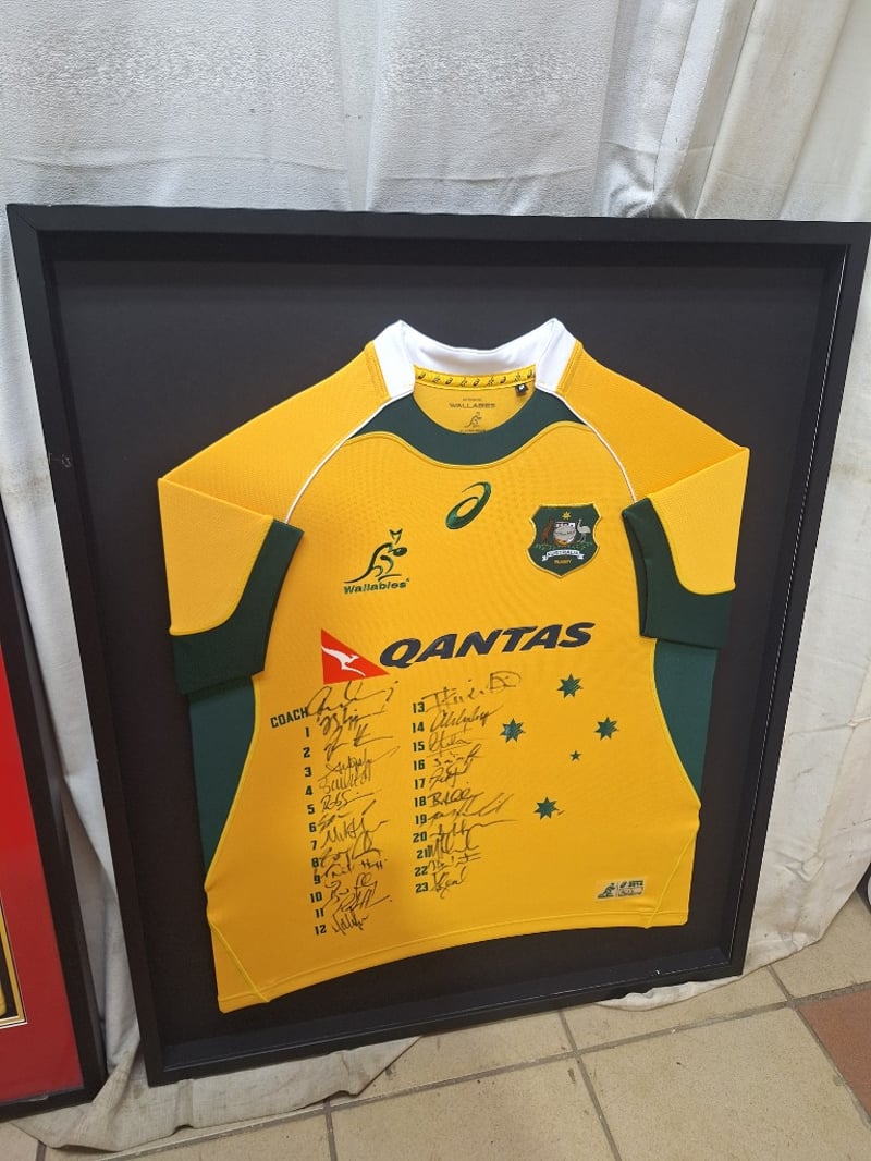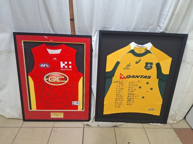 1 x WALLABIES signed jersey memorabilia black frame 78 x 59cm, 1 x AFL signed jersey memorabilia gold coast football club, 70 x 90cm, glass black frame