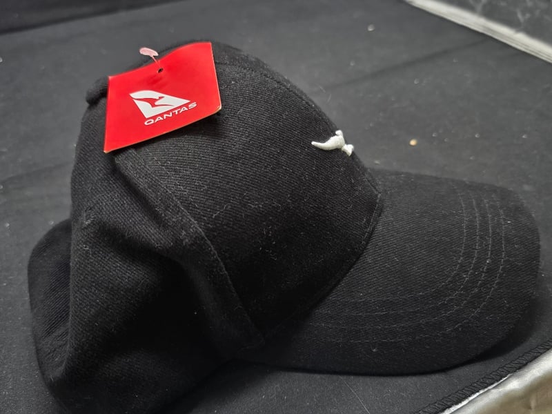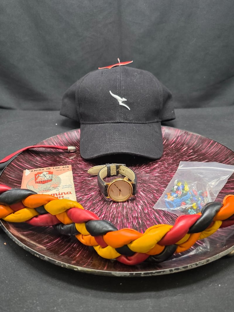 ASSORTMENT OF VINTAGE ITEMS INCLUDING QANTUS HAT, STAMINA IN THE AIR CARDS, FLOWER BRACELETS, AKTO WATCH, LEATHER HEADBAND AND FIREWORKS PLATE