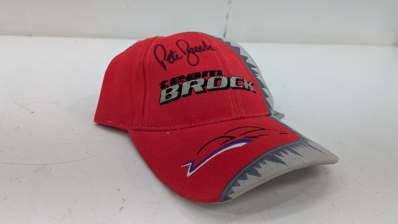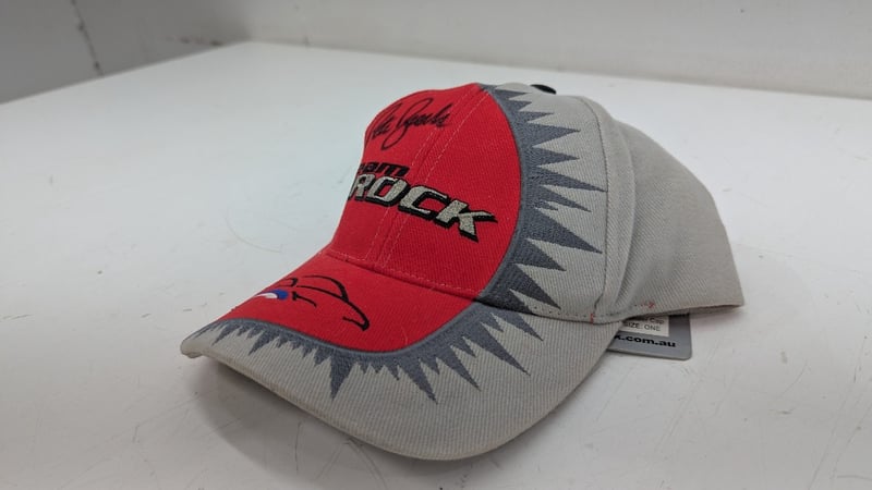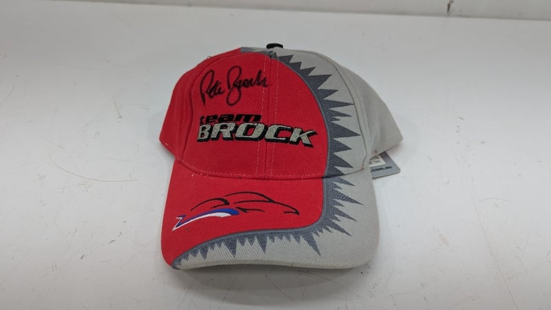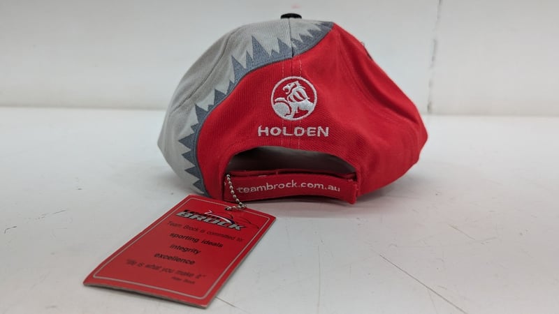 Red And Grey Adjustable Baseball Cap Featuring "Team Brock" Embroidery And Holden Branding. Cap Is Autographed By Peter Brock In Black Marker Across The Red Front Panel. Grey Rear Panels Display Distinctive Jagged Lightning Bolt Design In Navy. Includes Original Tag From Teambrrock.Com.Au. Collectible Motorsport Memorabilia From Legendary Australian Racing Driver Peter Brock'S Racing Team.