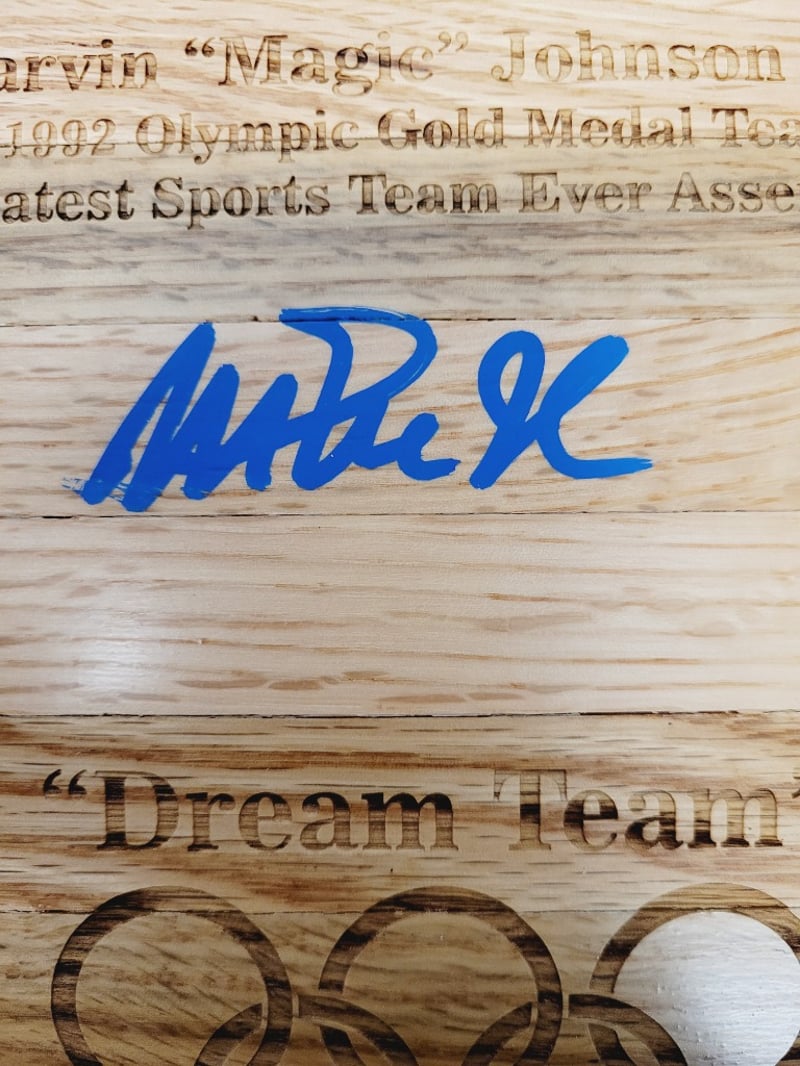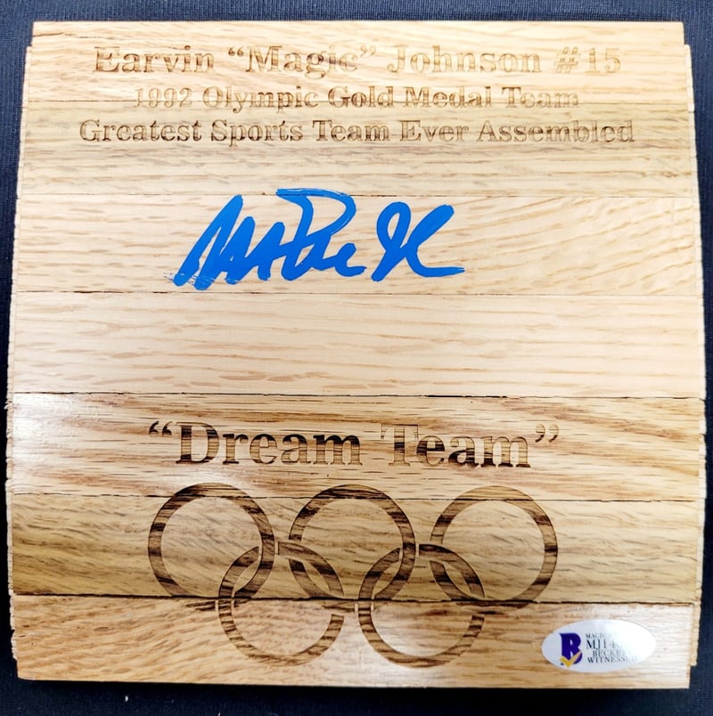 EARVIN " MAGIC " JOHNSON #15 SIGNED FLOORBOARD PIECE CELEBRATING THE 1992 U.S. OLYMPIC GOLD MEDAL BASKETBALL TEAM