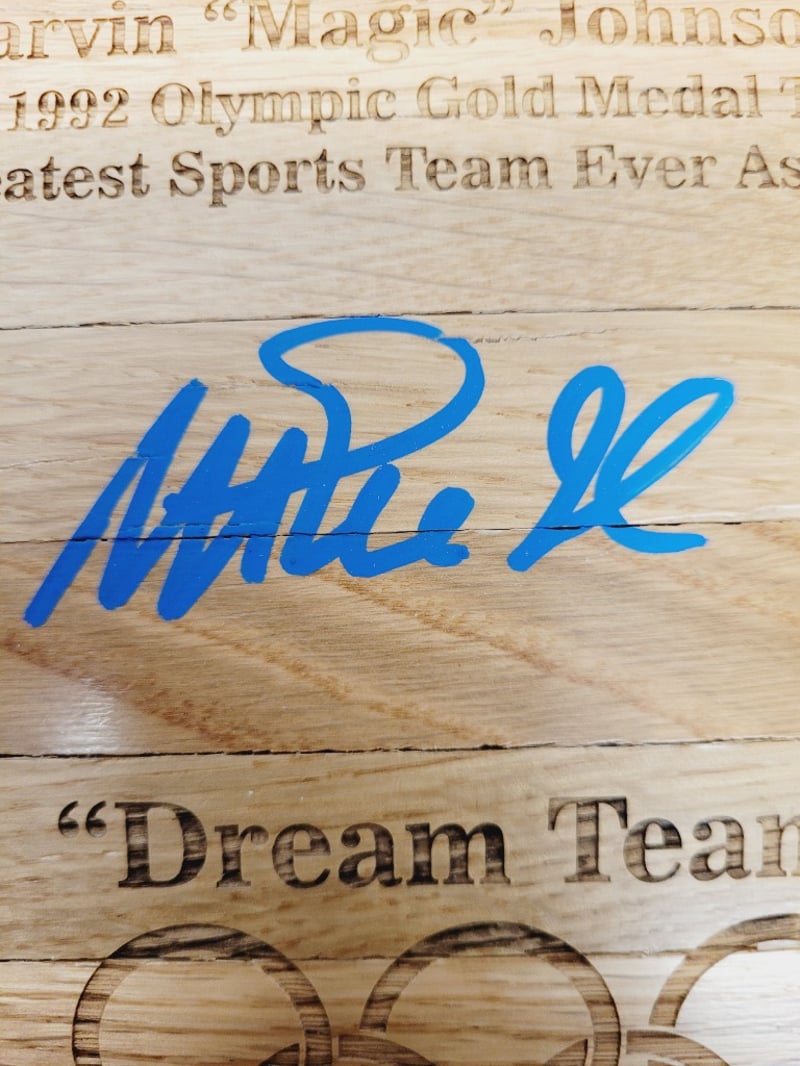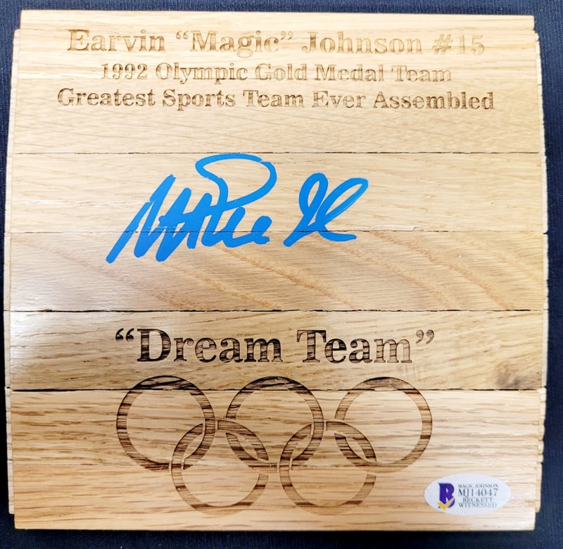 EARVIN " MAGIC " JOHNSON #15 SIGNED FLOORBOARD PIECE CELEBRATING THE 1992 U.S. OLYMPIC GOLD MEDAL BASKETBALL TEAM