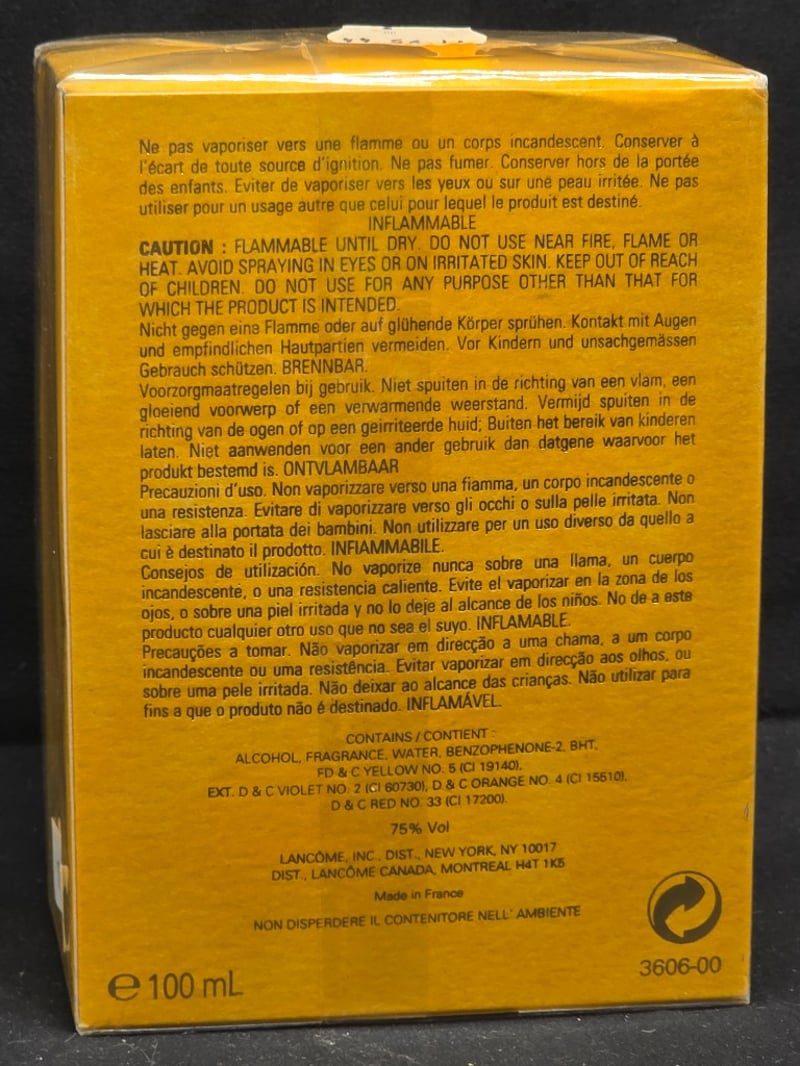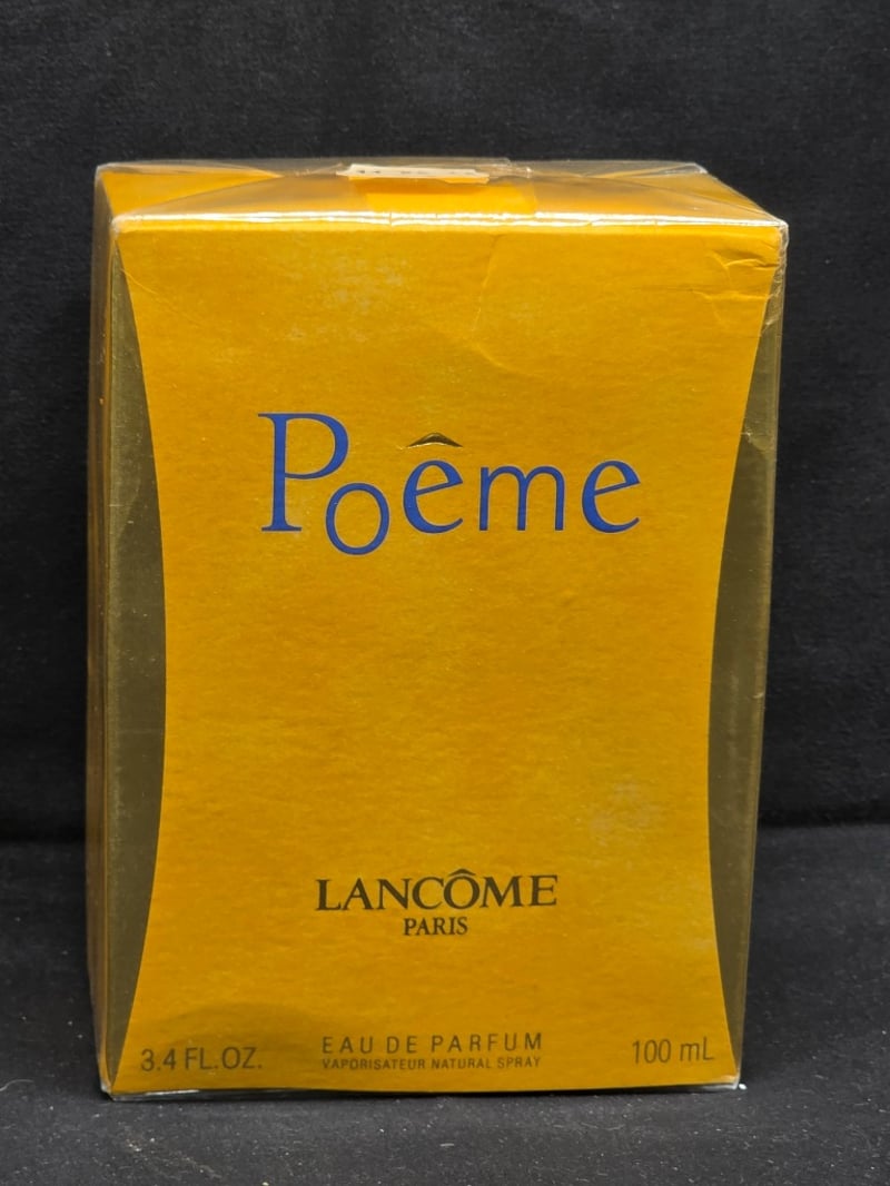 Sealed Vintage Lancôme Poême Eau De Parfum, 100Ml (3.4 Fl Oz) Spray Bottle In Original Golden Yellow Packaging. French Luxury Fragrance By Lancôme Paris, 75% Alcohol Content. Unopened With Intact Cellophane Wrap And Original Box Featuring Blue Branding And Multilingual Safety Instructions.