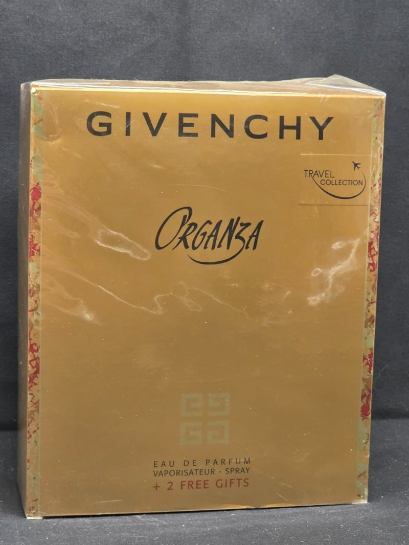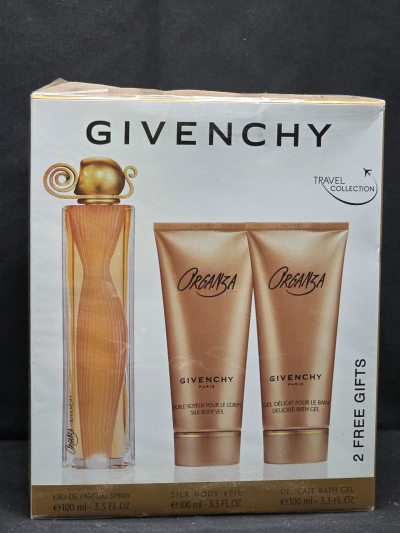 Vintage Givenchy Organza Travel Collection Comprising Eau De Parfum Spray (100Ml) With Iconic Golden Sculptural Stopper, Silk Body Veil (100Ml), And Delicate Bath Gel (100Ml). Sealed In Original Retail Packaging With Dual Gift Sets. Classic Amber Glass Bottle With Art Deco-Inspired Design. Includes Complementary Grooming Products For Travel Convenience.