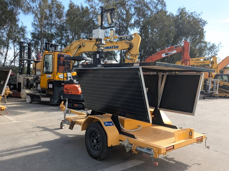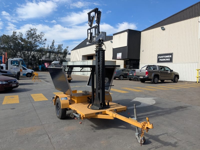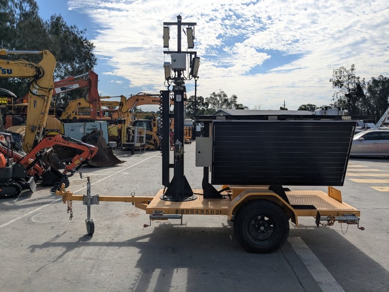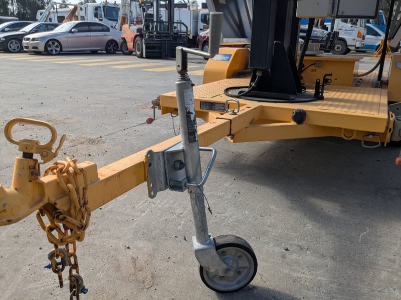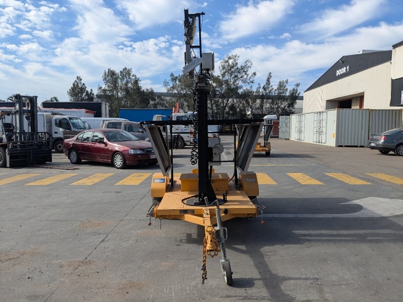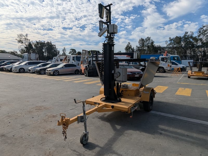 Description: Jockey Wheel, stabilising legs, telescopic light tower, 4 light sections, fuse box, light tower height from ground up 7.1mts approximately, trailer length 3mts, 1.3mts wide approximately,no key for box,