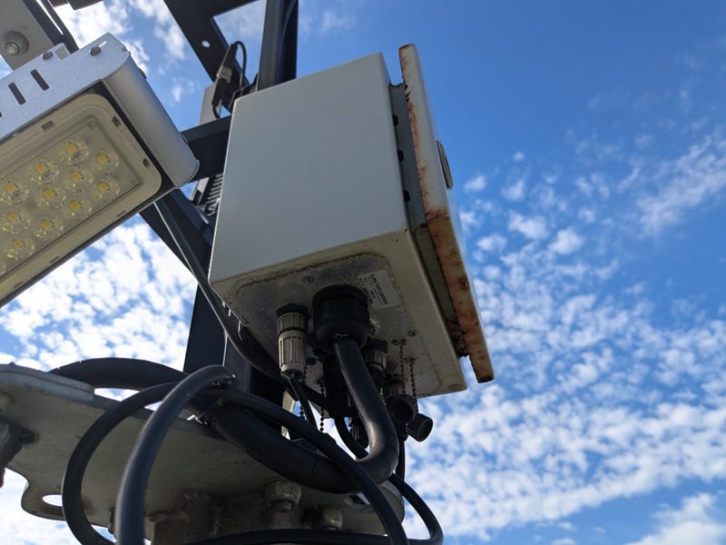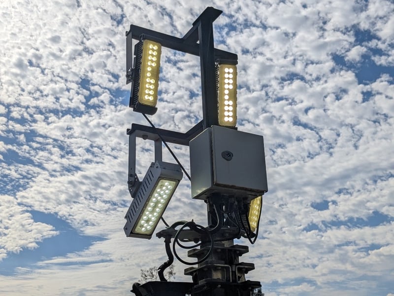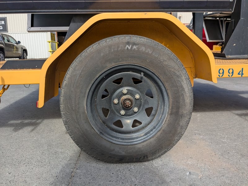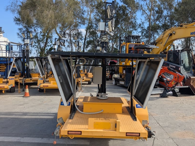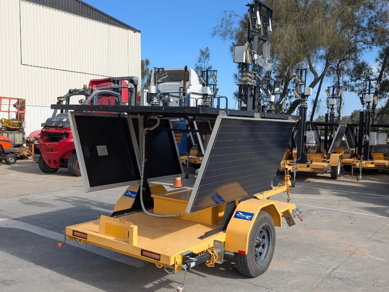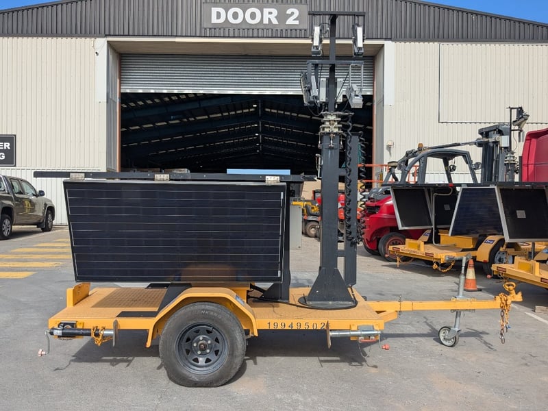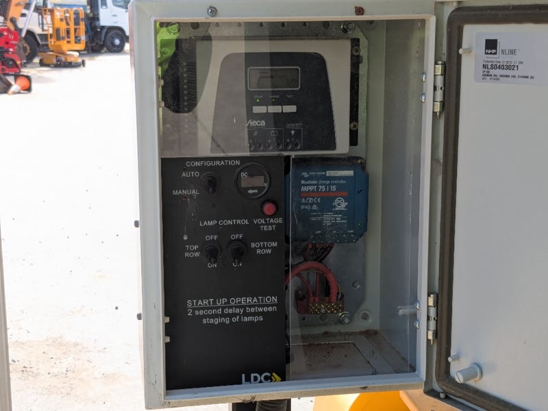 Description: Jockey Wheel, stabilising legs, telescopic light tower, 4 light sections, fuse box, light tower height from ground up 7.1mts approximately, trailer length 3mts, 1.3mts wide approximately,no key for box,