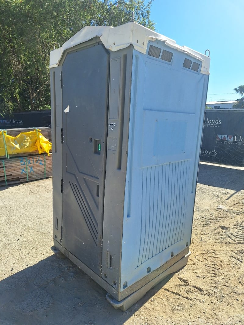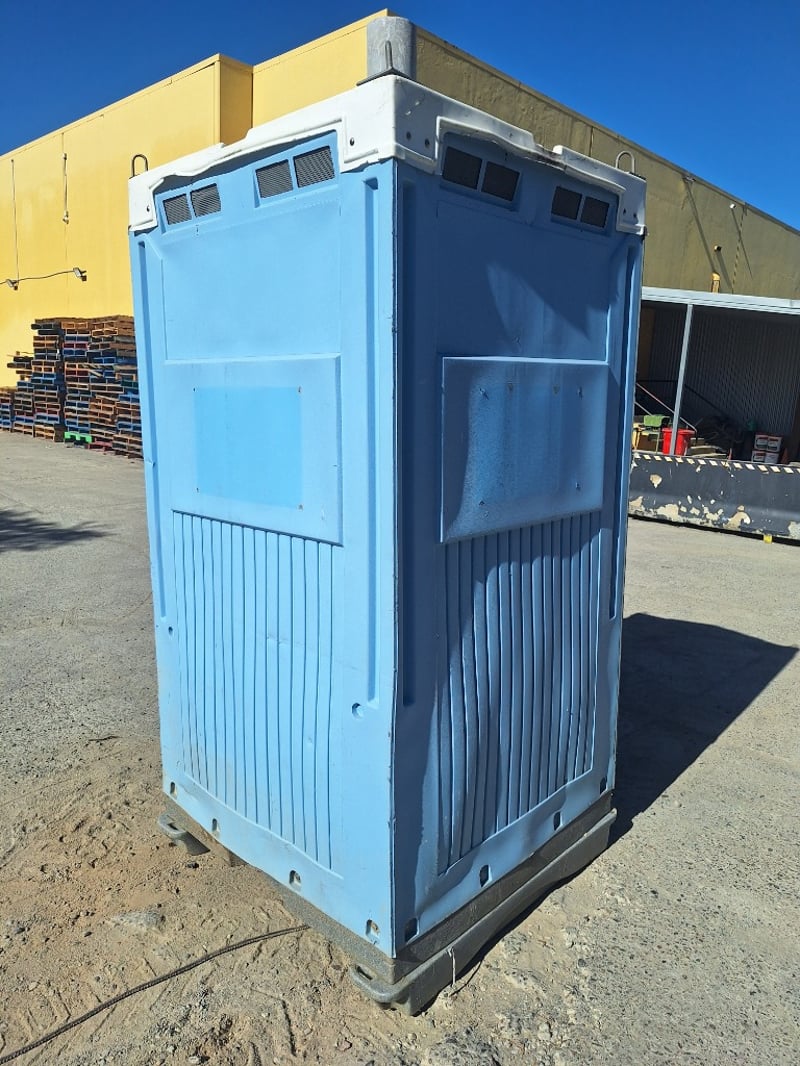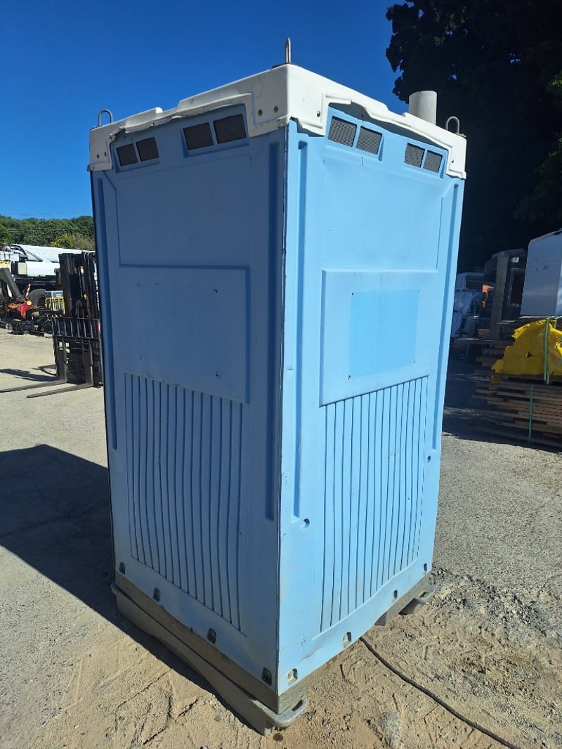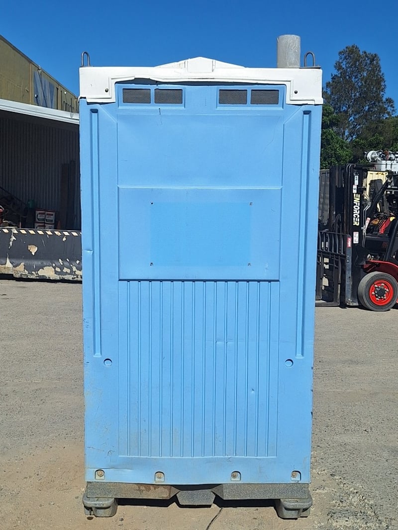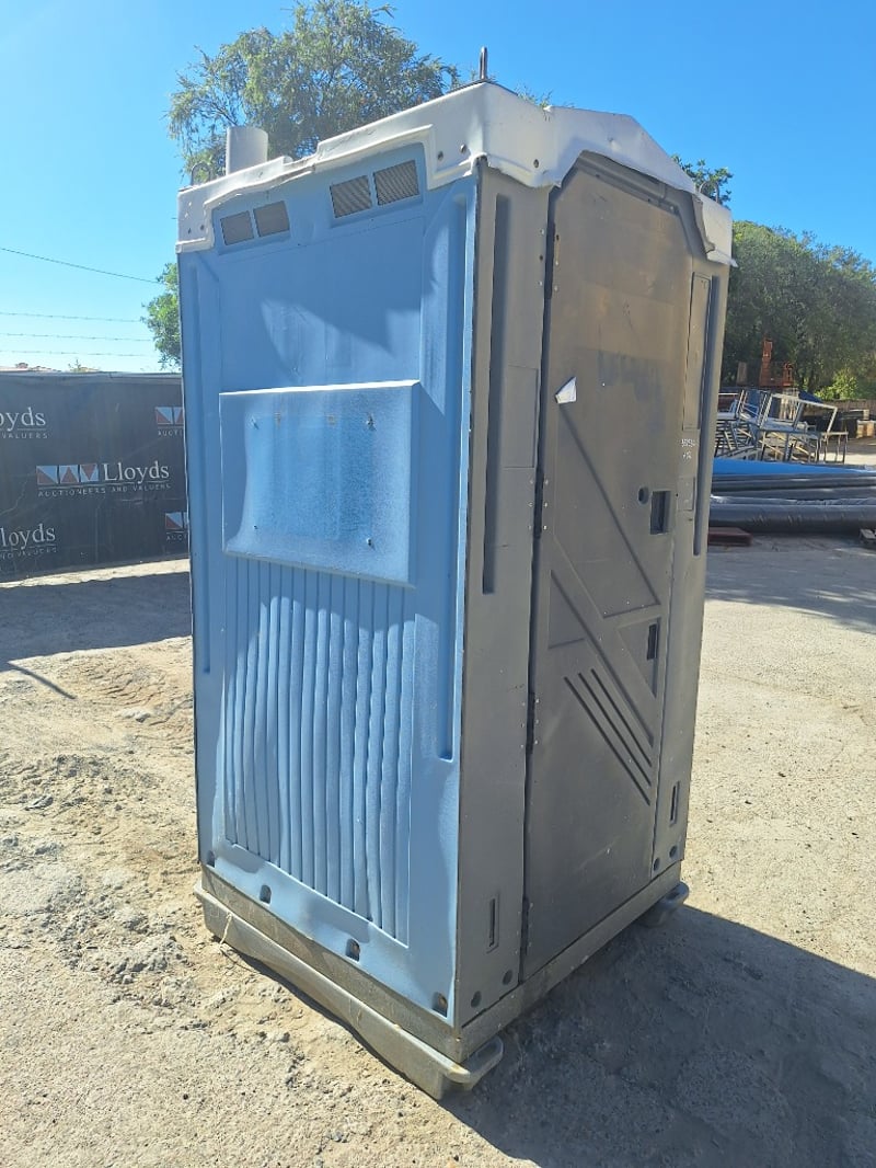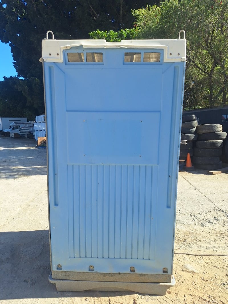 Portable chemical toilet cubicle in light blue,grey and white colour scheme. Self-contained unit featuring a pedestal-mounted bowl with white seat cover, dual flush mechanism, and grey interior panelling. Equipped with SofClear hand sanitiser dispenser and toilet paper holder. Includes ventilation windows with mesh screens on upper panels and carrying handles on roof. Grey carpet-style flooring with drainage holes.Suitable for temporary sanitation facilities at events, construction sites, or outdoor venues. Well-maintained exterior with minor weathering consistent with field use.