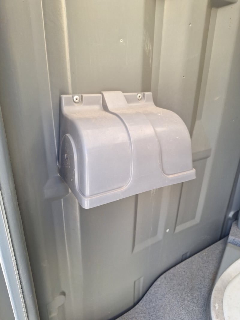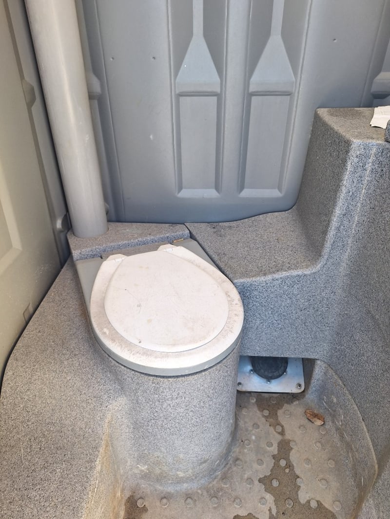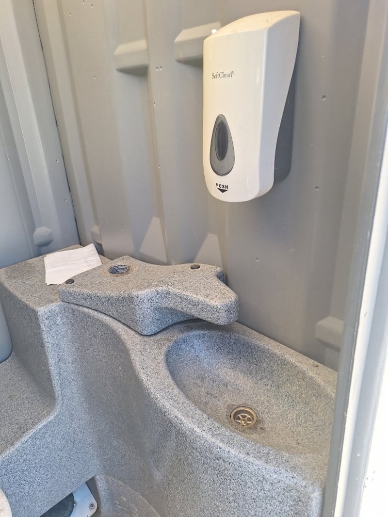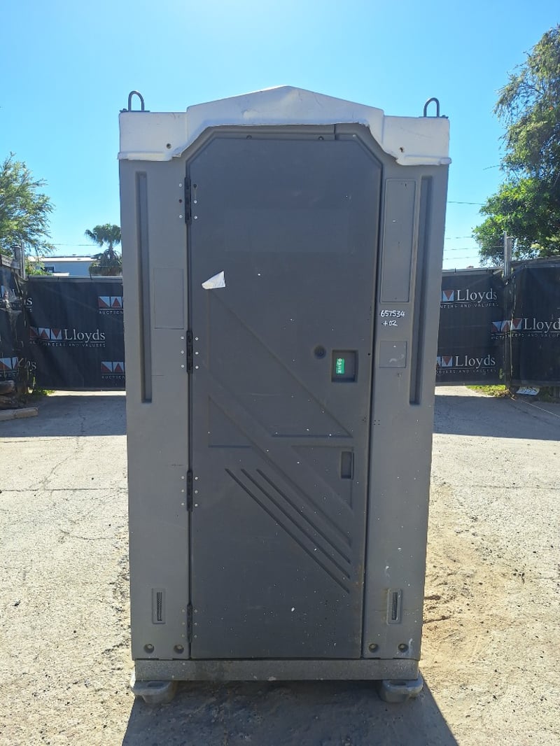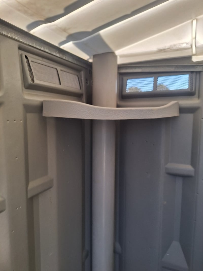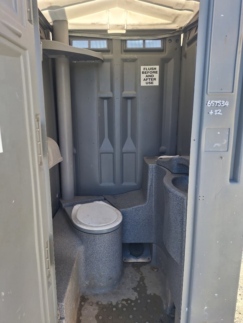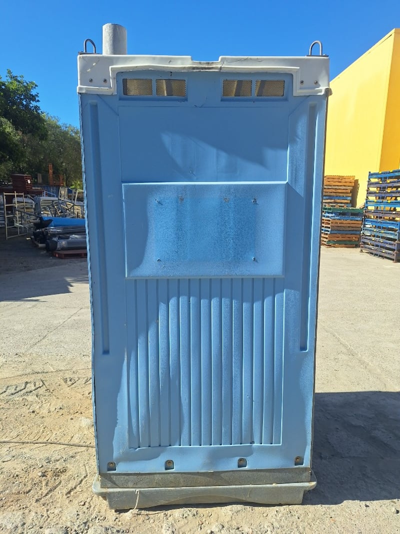 Portable chemical toilet cubicle in light blue,grey and white colour scheme. Self-contained unit featuring a pedestal-mounted bowl with white seat cover, dual flush mechanism, and grey interior panelling. Equipped with SofClear hand sanitiser dispenser and toilet paper holder. Includes ventilation windows with mesh screens on upper panels and carrying handles on roof. Grey carpet-style flooring with drainage holes.Suitable for temporary sanitation facilities at events, construction sites, or outdoor venues. Well-maintained exterior with minor weathering consistent with field use.