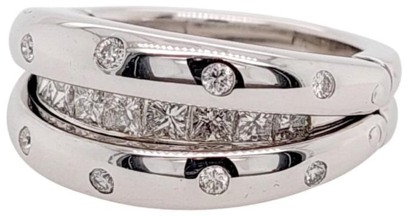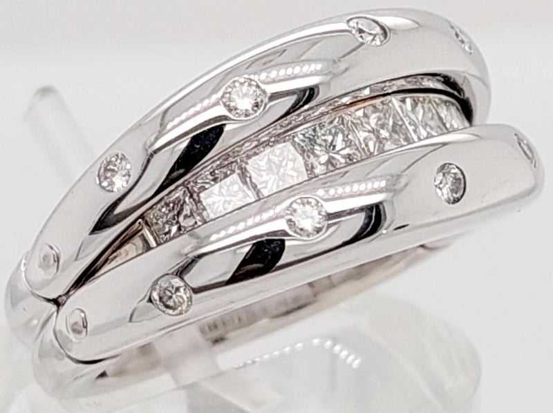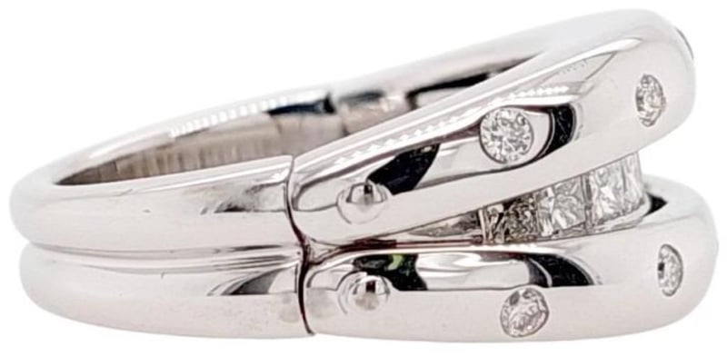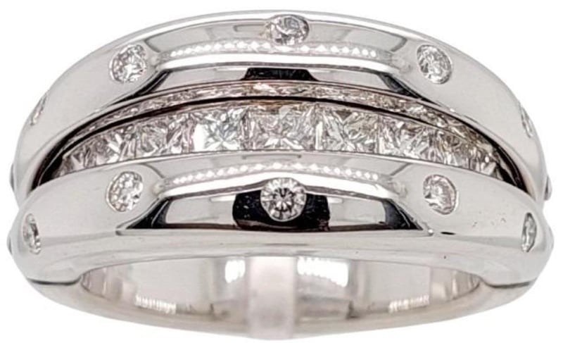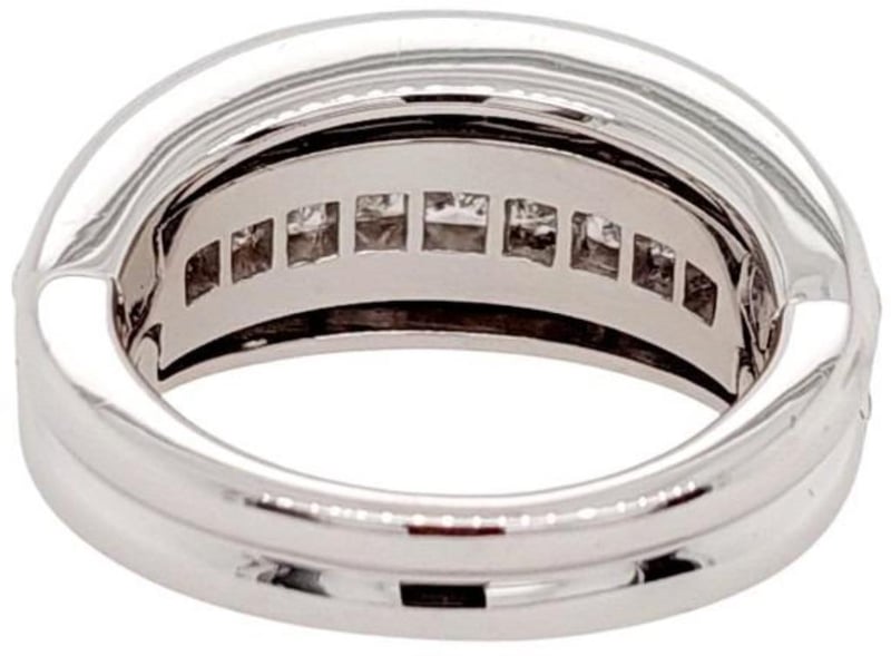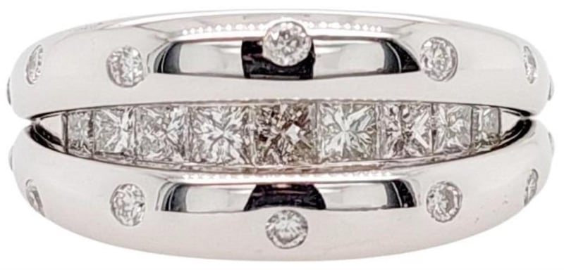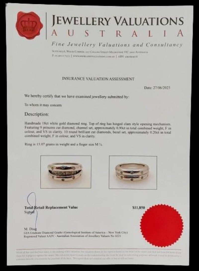 18CT WHITE GOLD AND DIAMOND RING WITH HINGED OPENING MECHANISM Total Item Weight: 13.07gms This Handmade 18Ct White Gold Ring With Clam Style Opening Mechanism Features 9 X Princess Cut Channel Set Diamonds, 0.90Ct In Total Combined Weight, Vs In Clarity And F In Colour. This Ring Also Features 10 X Round Brilliant Cut Bezel Set Diamonds, 0.20Ct In Total Combined Weight, Vs In Clarity And F In Colour. Ring Size: M 1/2 Jewellery Valuations Provided By A Third Party Professional Not Directly Associated With Lloyds Auctions at AUD $11850 This Insurance Valuation has been provided by a registered Jewellery Valuer and is intended for insurance purposes only. The valuation amount has no bearing on the auction value of the item. Any questions regarding the valuation should be directed to the issuing Valuer (refer to contact details on the certificate) as Lloyds have no association or relationship with the Valuer or the valuation amount contained within the valuation. Condition: Excellent- Refer Images 0 162901+105 CROSSDOCK
