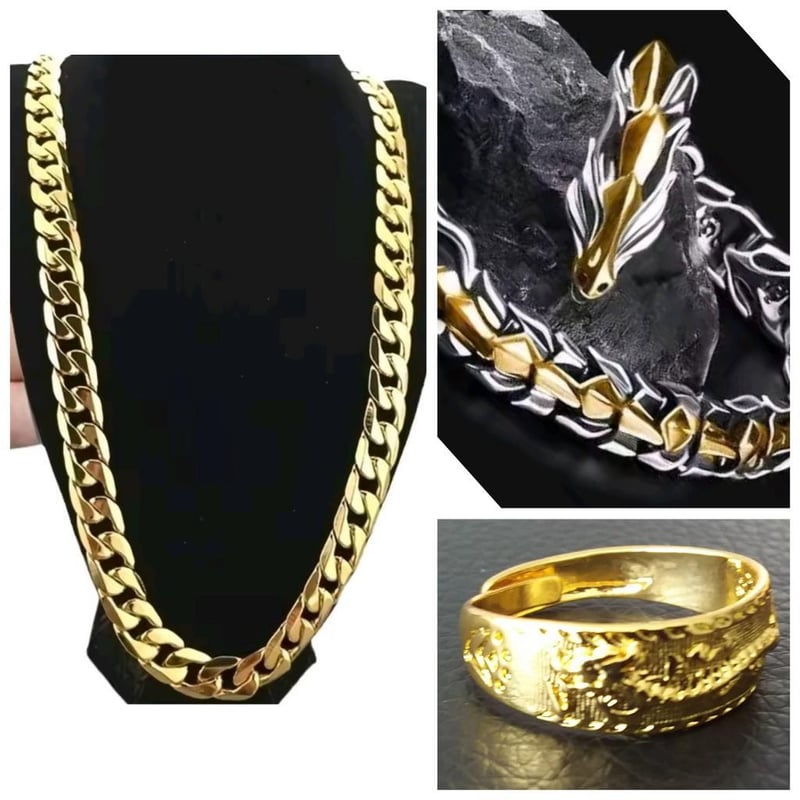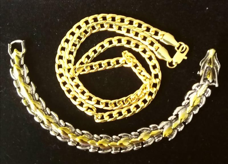 3 X GOLD STAINLESS STEEL UNISEX NECKLACE BRACELET AND RING Condition: Good - Refer to Images 0162945+21FC