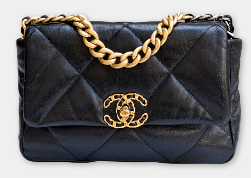 CHANEL BLACK SMALL GOATSKIN 19 Hardware: silver and antique gold hardware Measurements: 25 (W) x 17 (H) x 8 (D) cm Condition: hairlines on hardware and some tarnishing on hardware, unavoidably creases on the leather, inside is clean overall in 98% excellent condition Inclusions: dust bag, card and proof of authenticity +8