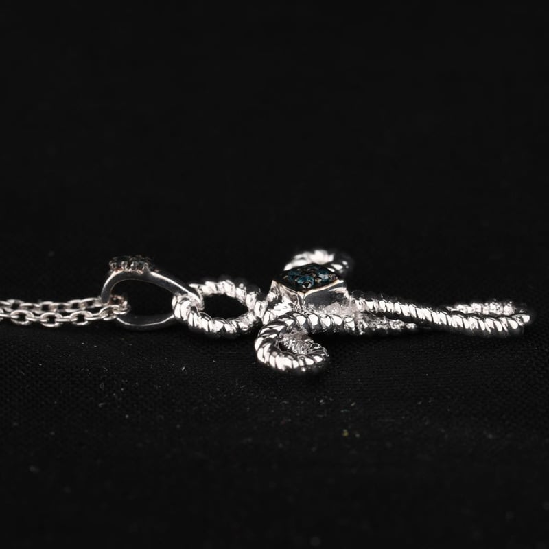 Exquisite Blue Diamond Pendant: A Symphony of Elegance Indulge in the allure of our breathtaking Blue Diamond Pendant, a stunning piece that captures the essence of sophistication and elegance. This exquisite pendant features six radiant blue diamonds, each meticulously cut to a precise 1.00mm, showcasing their mesmerizing hue that dances with light and captivates the eye. Set against a striking black pen rhodium backdrop, these diamonds create a dramatic contrast, enhancing their brilliance and depth. The pendant is elegantly suspended from a delicate chain featuring a secure spring lock, ensuring both style and functionality. With a metal weight of 1.50 grams, the piece is lightweight yet durable, making it perfect for both everyday wear and special occasions. This luxurious accessory is not just a piece of jewelry; it’s a statement of your refined taste and appreciation for the finer things in life. Whether you’re dressing up for an evening gala or adding a touch of glamour to your everyday ensemble, this Blue Diamond Pendant is the perfect finishing touch. Don’t miss the opportunity to own this timeless treasure—place your bid today and let your elegance shine!