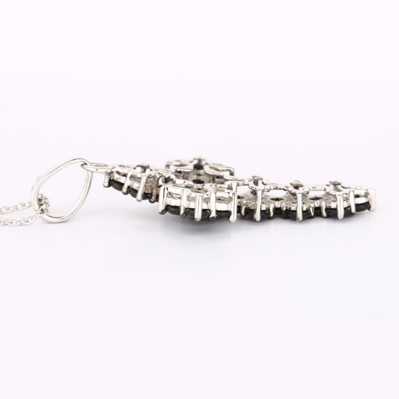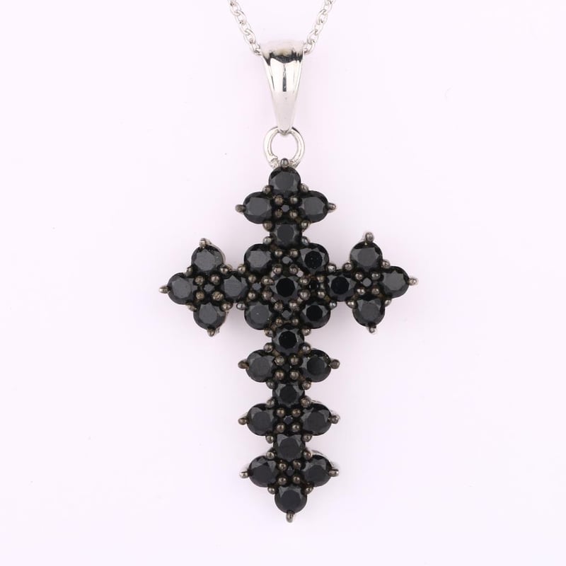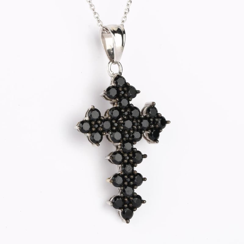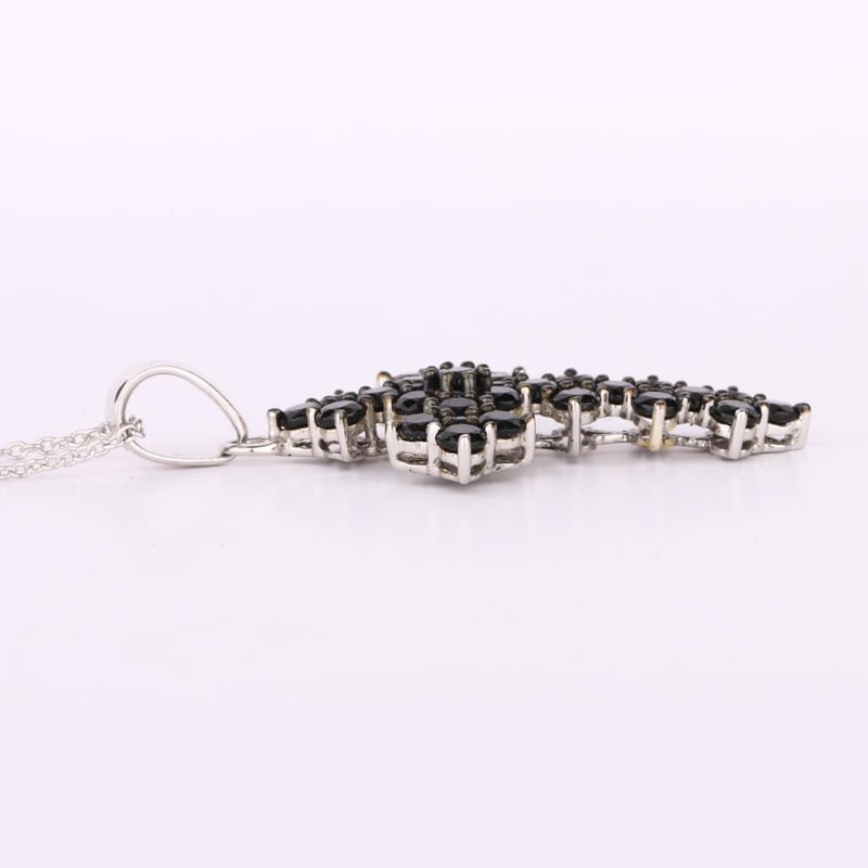 Exquisite Black Spinel Pendant with Radiant Allure Elevate your elegance with this stunning pendant featuring a captivating arrangement of black spinels. Crafted to perfection, this piece showcases 27 round black spinels at 3.00mm each and 10 round black spinels at 1.00mm, creating a mesmerizing contrast that embodies both sophistication and boldness. The lustrous black spinels, renowned for their depth and brilliance, are artfully set without the use of black pan rhodium, allowing their natural beauty to shine through. Weighing a delicate 1.50 grams, this pendant is suspended from a chic SP 1 chain with a secure spring lock, ensuring comfort and wearability. The thoughtful design highlights the luxurious allure of the black spinels, making it an ideal statement piece for any occasion, whether it be a glamorous evening soiree or a sophisticated daytime affair. Indulge in the timeless elegance of this exquisite black spinel pendant, where craftsmanship meets luxury, and let it illuminate your collection with its enchanting charm.
