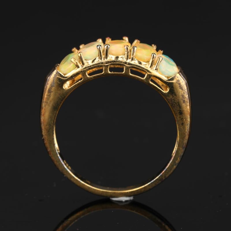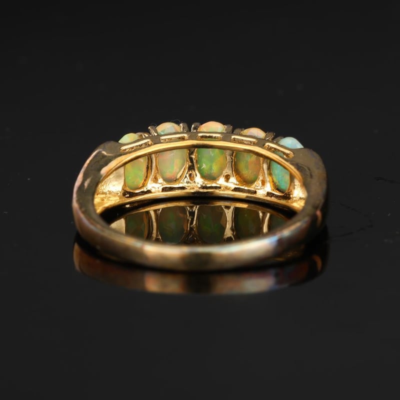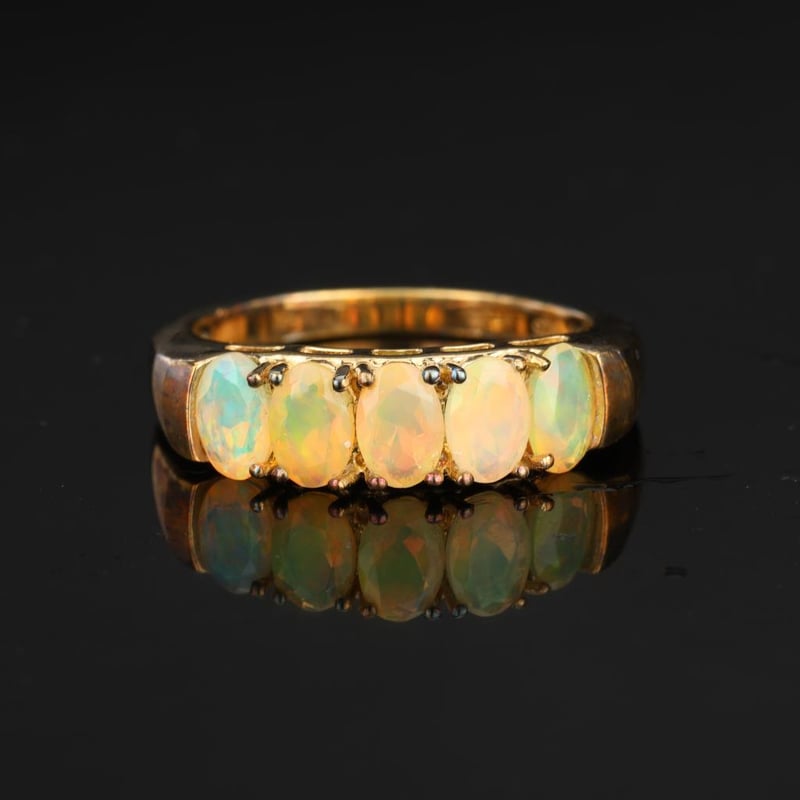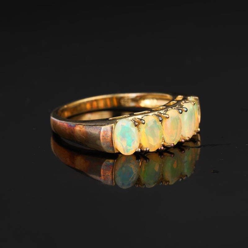 Ethiopian Opal Oval 6x4mm - 5Pcs RingStep into a world of ethereal beauty with this exquisite Ethiopian Opal Ring, featuring five mesmerizing oval stones, each measuring 6x4mm. Each opal is a stunning testament to nature’s artistry, showcasing a kaleidoscope of colors that dance and shimmer with every movement. The unique play of light within each opal reveals enchanting hues of shimmering blues, fiery oranges, and radiant greens, making this ring a true conversation starter.Crafted with precision, the opals are elegantly set in a polished band that accentuates their natural brilliance. The harmonious arrangement of these five opals creates a striking visual impact, perfect for those who appreciate the extraordinary. Whether worn as an everyday statement piece or saved for special occasions, this ring embodies the luxurious allure of Ethiopian opal, a gemstone revered for its captivating beauty and rarity.Let this enchanting piece be a part of your jewelry collection, a timeless treasure that celebrates the exquisite charm of nature’s finest creations. Embrace the magic of Ethiopian opal and indulge in a piece that is as unique as you are.