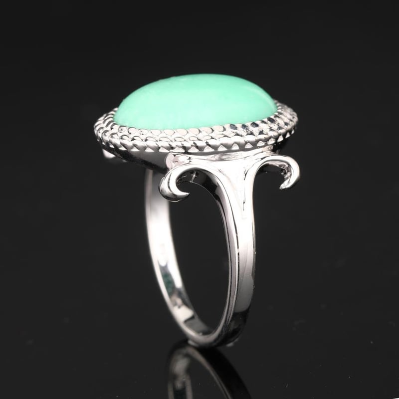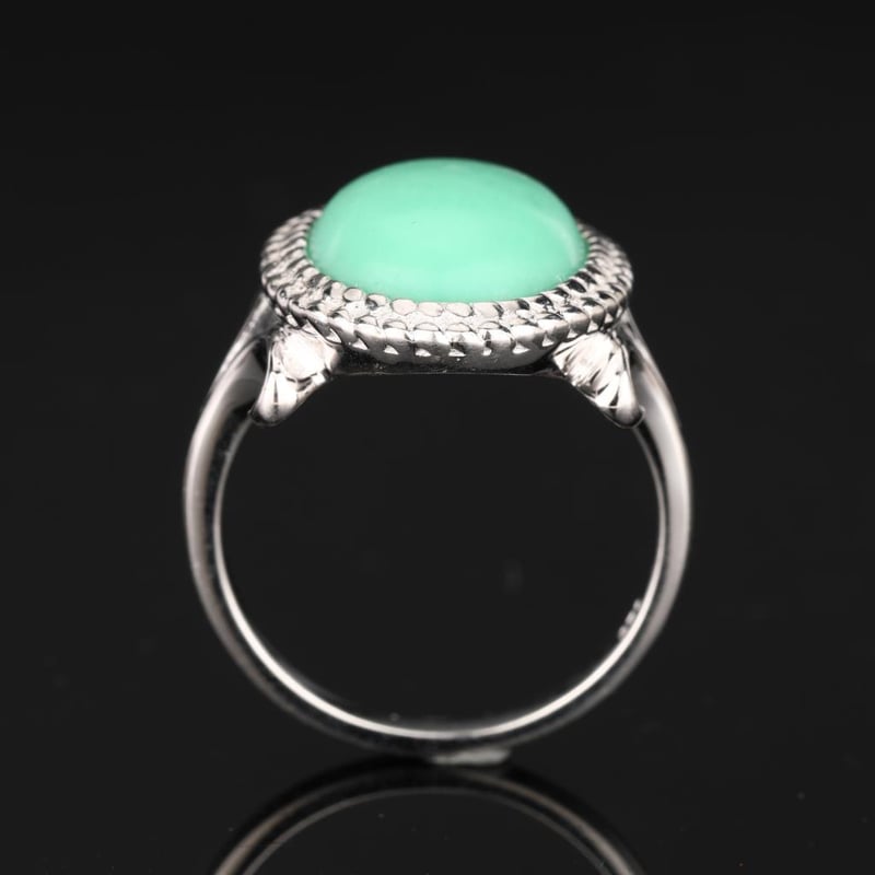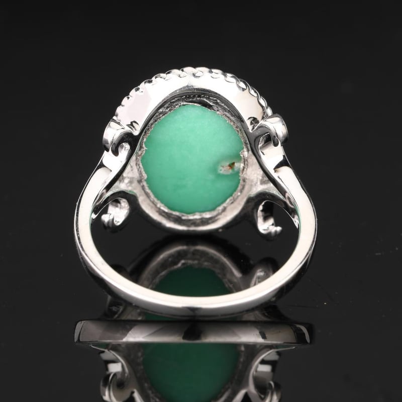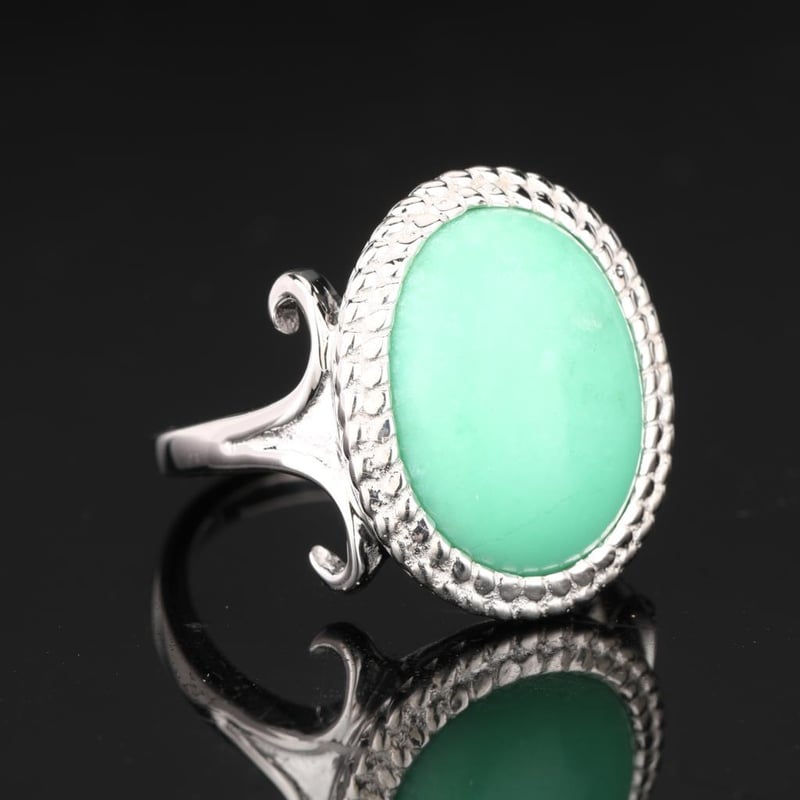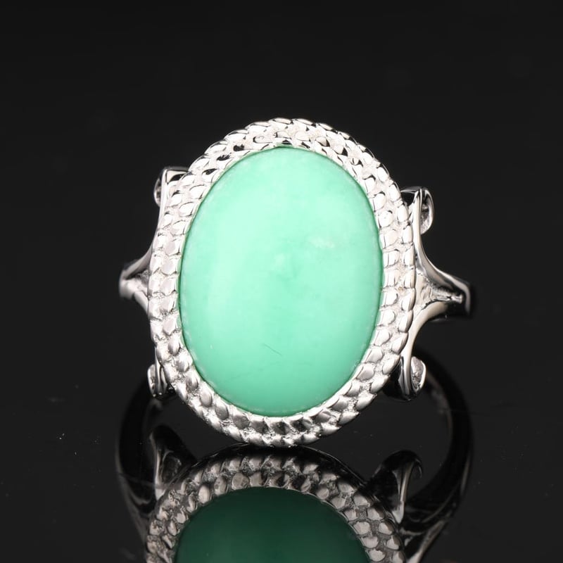 Lustrous Crysophase CAB Oval Ring - A Unique 16x12mm Gemstone MasterpieceDiscover the captivating allure of this exquisite Crysophase CAB Oval Ring, featuring a stunning 16x12mm gemstone that radiates elegance and sophistication. Set in a meticulously crafted band, this ring showcases a vibrant green hue with delicate swirls and patterns, reminiscent of lush landscapes and tranquil waters. The Crysophase, known for its captivating play of color and soothing energy, is expertly cut to maximize its natural beauty, delivering a mesmerizing depth that draws the eye. Perfect for both casual wear and special occasions, this striking piece offers versatility and charm to any jewelry collection.Adorn your finger with this luxurious ring, a true statement piece that embodies both individuality and grace. Whether as a gift for a loved one or a personal indulgence, this Crysophase CAB Oval Ring promises to become a cherished heirloom for generations to come. Don’t miss the opportunity to own this unique treasure—bid now and elevate your jewelry collection to new heights!