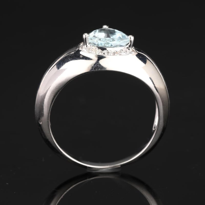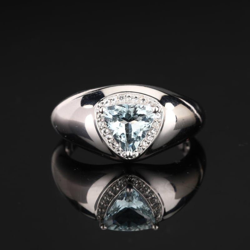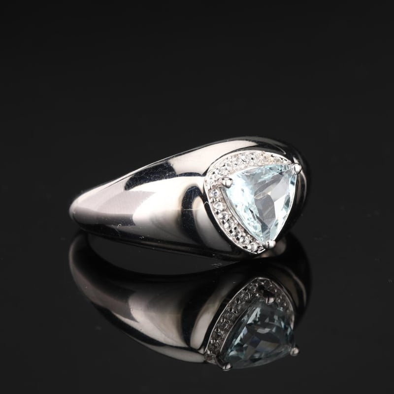 Tranquil Elegance: Aquamarine and White Topaz RingEmbrace the serene beauty of the sea with this exquisite ring featuring a stunning AA-grade Trillion Aquamarine at 8.00mm, elegantly cradled at its center. This captivating gem radiates a soft, tranquil blue reminiscent of sunlit ocean waves, evoking feelings of calm and clarity. Surrounding the aquamarine are 23 dazzling round White Topaz stones, each measuring 1.00mm, that sparkle with a brilliance akin to starlight reflecting on water.Crafted with meticulous attention to detail, this ring is more than just a piece of jewelry; it is a statement of refined sophistication and grace. The harmonious interplay of the vibrant aquamarine and the shimmering white topaz creates a striking contrast, making this ring a perfect accessory for both casual outings and elegant soirées.Dare to make a statement with this enchanting ring that captures the essence of tranquility and sophistication, offering a timeless addition to any jewelry collection. Whether you wear it to elevate your everyday look or to dazzle at special occasions, this piece is sure to leave a lasting impression. Don’t miss the opportunity to own this extraordinary blend of nature’s finest gems.