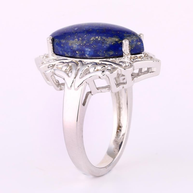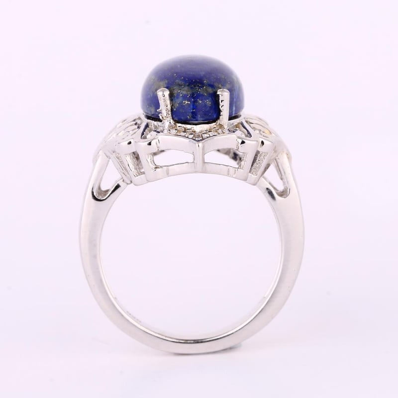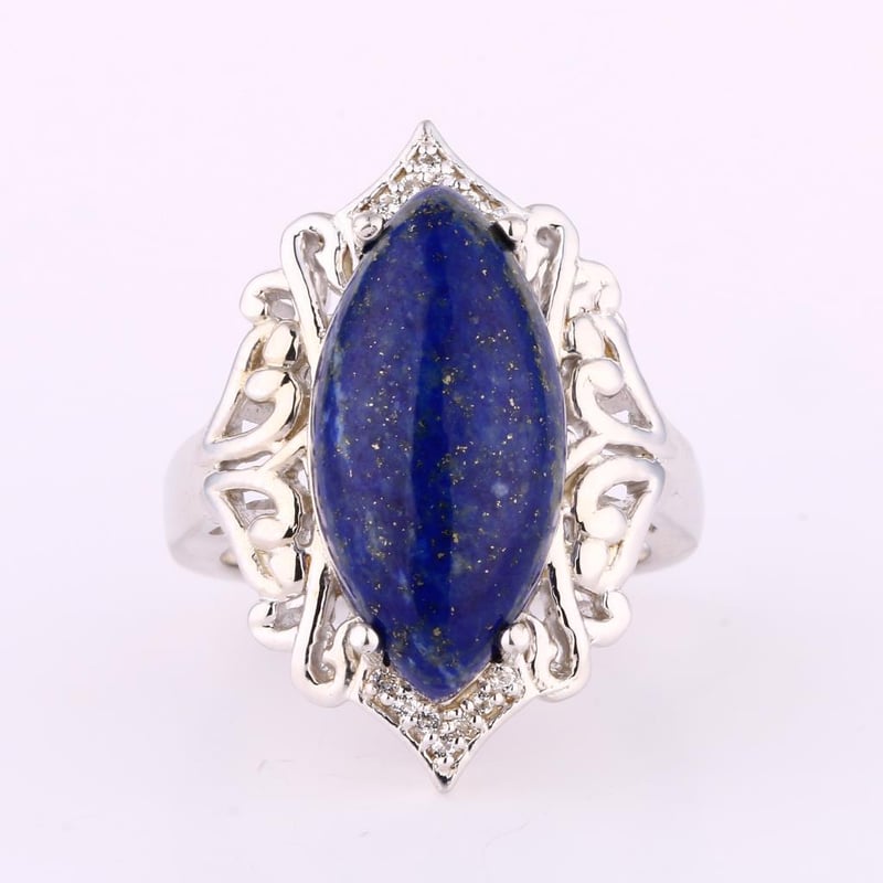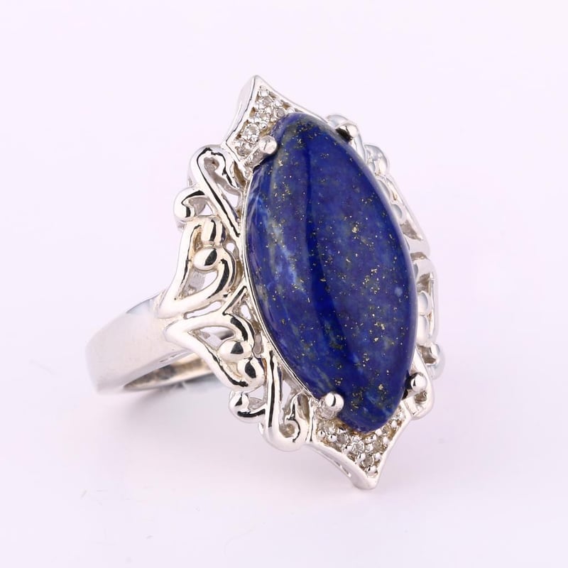 Celestial Elegance: Lapis Lazuli and White Topaz RingStep into a realm of timeless elegance with this exquisite ring, a harmonious blend of rich lapis lazuli and sparkling white topaz. At its heart lies a stunning marquise-cut lapis cabochon, measuring 20x10mm, radiating a deep azure hue reminiscent of the night sky dotted with stars. This captivating gemstone is not only a symbol of wisdom and truth but also a statement of sophistication that beckons admiration.Surrounding the luxurious lapis are a dazzling arrangement of fourteen meticulously set white topaz stones. Four round topaz measuring 1.20mm and ten round topaz at 1.00mm catch the light brilliantly, adding a scintillating contrast to the deep blue of the lapis. Each topaz gem is expertly faceted to enhance its brilliance, creating a sparkling halo that elevates the central stone to new heights of grandeur.Crafted with precision and care, this ring embodies a balance of boldness and refinement, making it an ideal piece for both everyday wear and special occasions. Whether gracing your own collection or presented as a cherished gift, this ring is a true testament to the beauty of nature’s finest creations. Embrace the allure of this celestial treasure and let it illuminate your style with its enchanting charm.