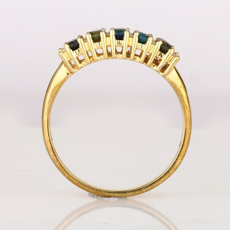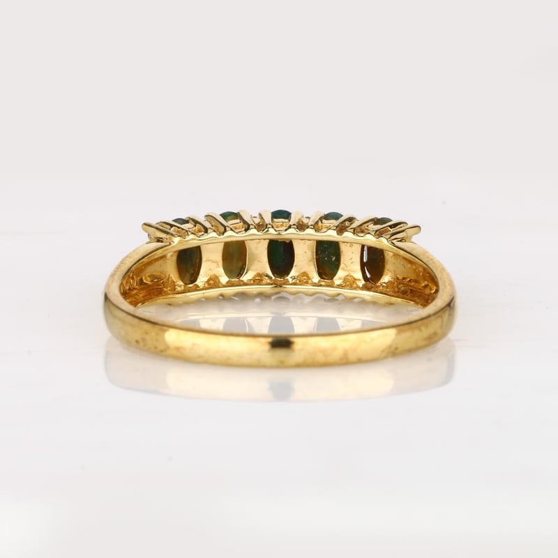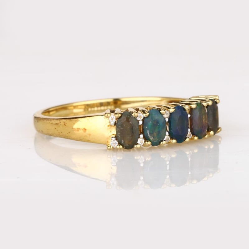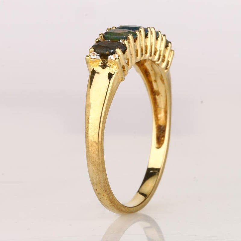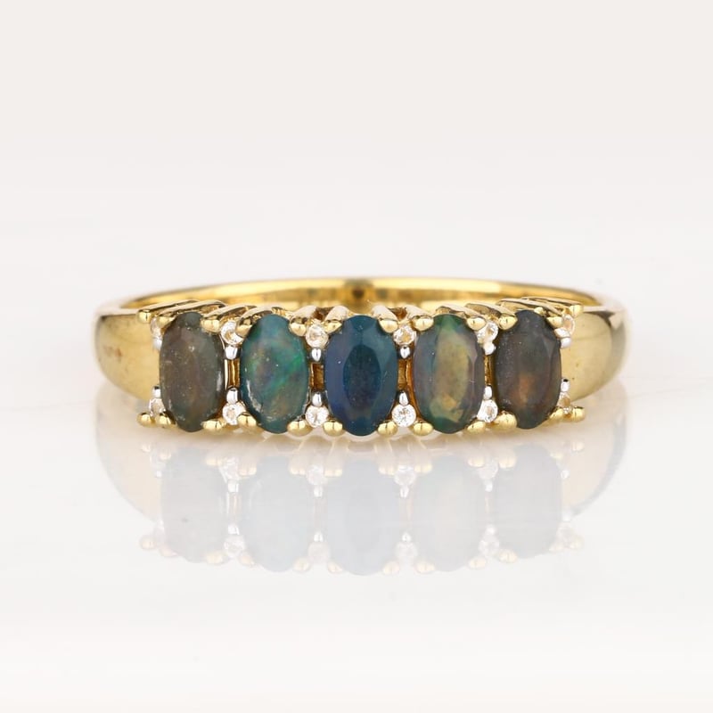Ethereal Elegance: Dyed Black Ethiopian Opal and White Topaz RingStep into a realm of sophisticated luxury with this exquisite ring, showcasing five stunning dyed black Ethiopian opals, each perfectly cut into a mesmerizing oval shape of 5x3mm. The opals, celebrated for their enigmatic depth and captivating play-of-color, are enhanced by their deep black hue, which elegantly contrasts with the vivid brilliance of twelve round white topaz stones, each measuring 1.00mm. Crafted in white pen rhodium, this ring not only exudes a contemporary charm but also provides a lustrous backdrop that amplifies the allure of the gemstones. The harmonious blend of dark and light creates a striking visual impact, making it a perfect statement piece for any occasion. Whether you’re attending an elegant soirée or looking to elevate your everyday style, this ring is a true embodiment of grace and sophistication. Don’t miss the chance to own this masterpiece that beautifully captures the essence of modern luxury.