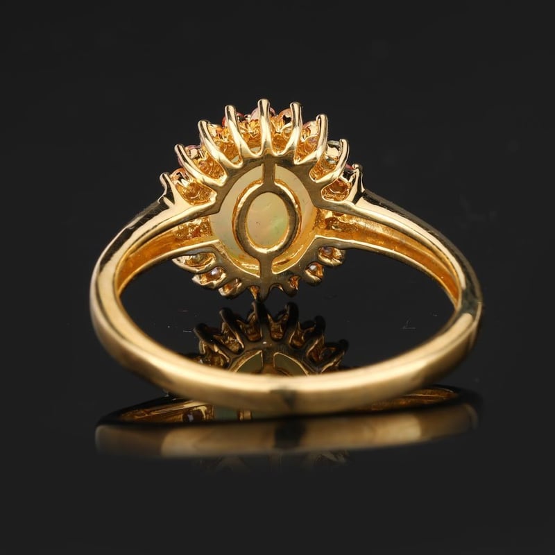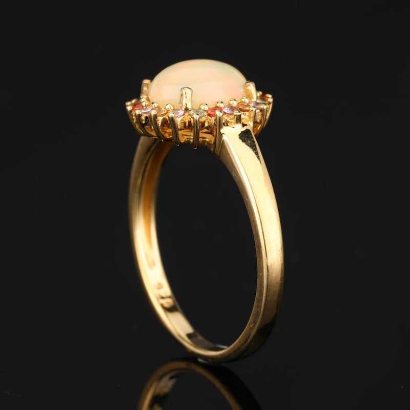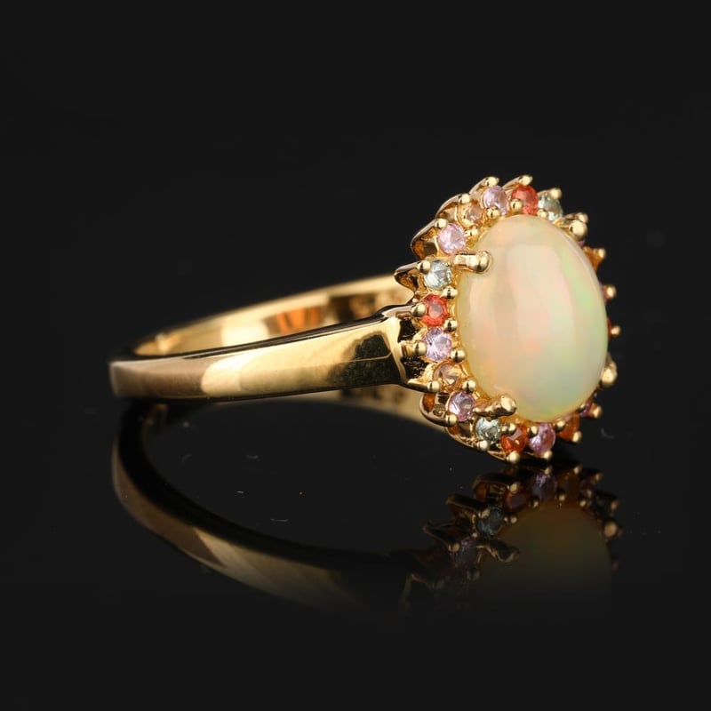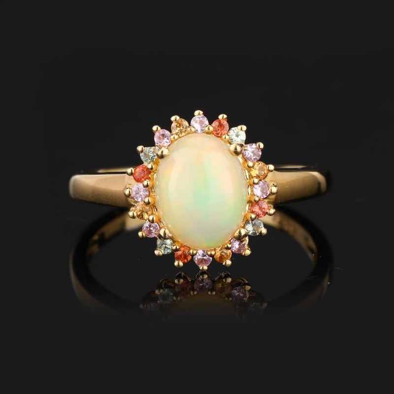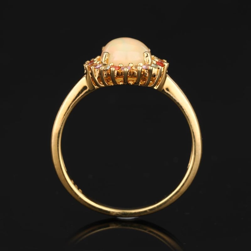 Ethereal Harmony: Ethiopian Opal and Sapphire Symphony RingStep into a world of exquisite elegance with this breathtaking ring, a true testament to the artistry of fine jewelry. At its heart lies an AAA-grade Ethiopian opal, a mesmerizing cabochon cut in a stunning oval shape (10x8mm) that captures the very essence of the universe with its kaleidoscopic play-of-color. Each glance reveals a delightful dance of fiery reds, tranquil blues, and ethereal greens, making this opal a celestial centerpiece that is sure to captivate.Encircling this opulent gem is a vibrant array of sapphires, each meticulously chosen for their dazzling brilliance and exceptional quality. Four round pink sapphires (1.50mm) radiate warmth and charm, while an enchanting quartet of green sapphires (1.50mm) adds a touch of nature’s freshness. The lively orange sapphires (1.50mm) infuse an invigorating zest, elegantly complemented by the serene essence of blue sapphires (1.50mm) that evoke the depths of a tranquil sea. Together, these sapphires create a harmonious symphony of color, perfectly accentuating the opal’s ethereal glow.Crafted with a minimum band width of 2.00mm, this ring not only exudes luxury but also offers a comfortable fit for everyday elegance. With its stunning J-back design, the ring ensures a secure yet graceful wear, making it an ideal companion for any occasion—be it a glamorous evening gala or a casual day out.Indulge in the allure of this extraordinary piece, where nature's wonders unite in a masterpiece that embodies both sophistication and individuality. Don’t miss your chance to own this enchanting ring, a true celebration of color and craftsmanship that will be cherished for generations to come.