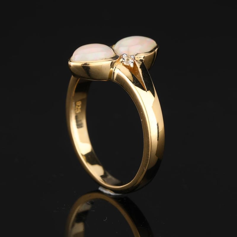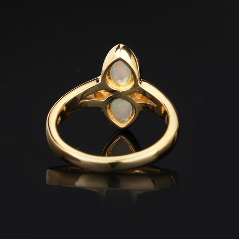 Ethiopian Opal and White Topaz Elegance RingIndulge in the ethereal beauty of this stunning ring, featuring two exquisite 7x5mm Ethiopian Opal cabochons that captivate the eye with their mesmerizing play of color. Each opal glimmers with a kaleidoscope of fiery reds, vibrant greens, and deep blues, reminiscent of a celestial dance captured within a precious stone. Complementing these opals are two radiant 1.80mm round white topaz gemstones, each meticulously set to enhance the ring’s luminosity and allure.Crafted in lustrous white pen rhodium, this ring exudes a modern elegance that ensures it stands out in any collection. The sleek, shimmering finish not only highlights the natural beauty of the opals and topaz but also provides a durable and tarnish-resistant surface that will keep your jewelry looking pristine for years to come.Whether worn as a statement piece for a special occasion or as an everyday adornment, this ring is a celebration of nature’s artistry and sophisticated design. Embrace the magic of Ethiopian opals and the timeless charm of topaz; bid now to make this enchanting piece yours.