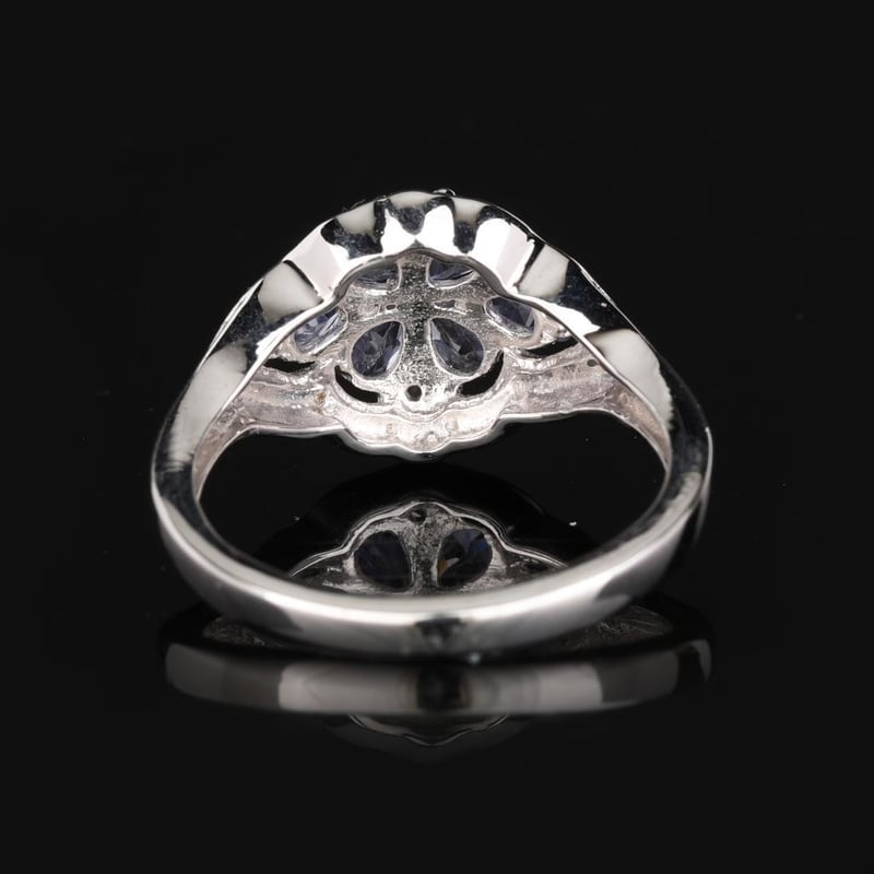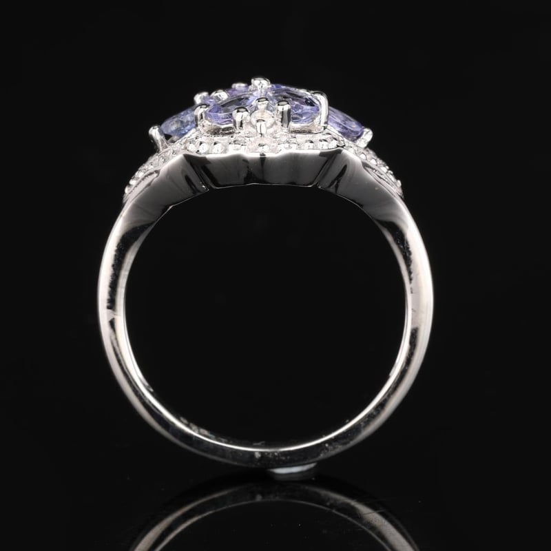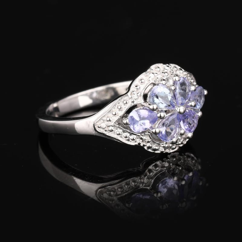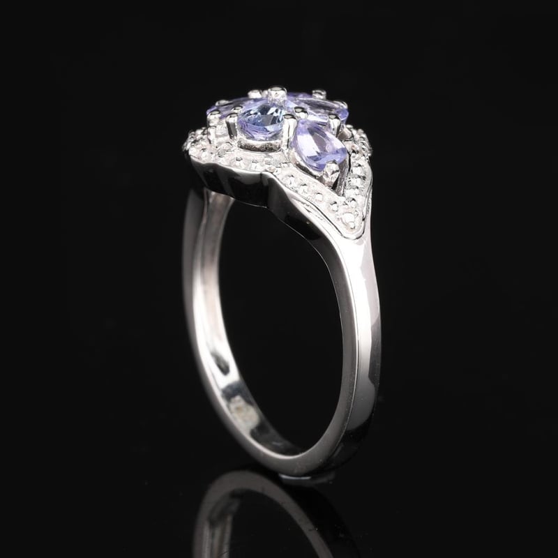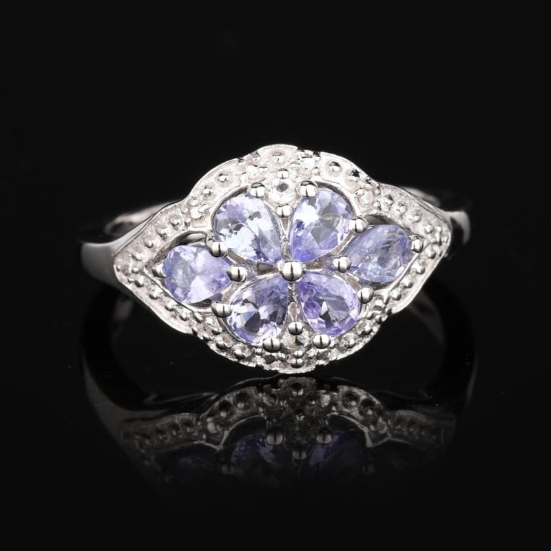 Lavender Tanzanite and White Topaz Elegance RingIndulge in the enchanting beauty of this exquisite ring, featuring a harmonious blend of 8 radiant lavender tanzanite pears, each measuring 6x4mm, artfully complemented by a sparkling round white topaz of 2.00mm. The soft hue of the lavender tanzanite evokes the serene allure of twilight, while the brilliance of the white topaz adds a striking contrast, creating a piece that captures the eye and captivates the heart.This ring, designed to mimic the aesthetic of high-end luxury, showcases a masterful arrangement of gemstones that dazzle from every angle. The delicate pear shapes of the tanzanite are meticulously set to reflect light, offering a gentle play of color that dances with every movement. Whether worn as a statement piece for a special occasion or as a stunning addition to your everyday ensemble, this ring is a testament to elegance and sophistication. Don't miss the opportunity to own a piece that exudes timeless charm and contemporary flair—perfect for the discerning jewelry lover seeking to elevate their collection.