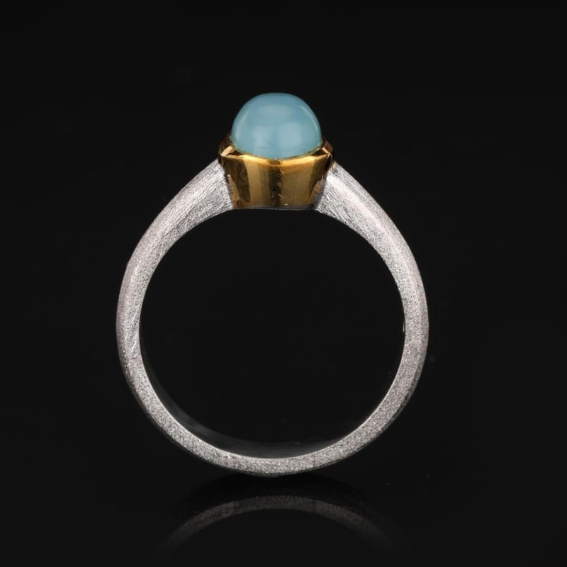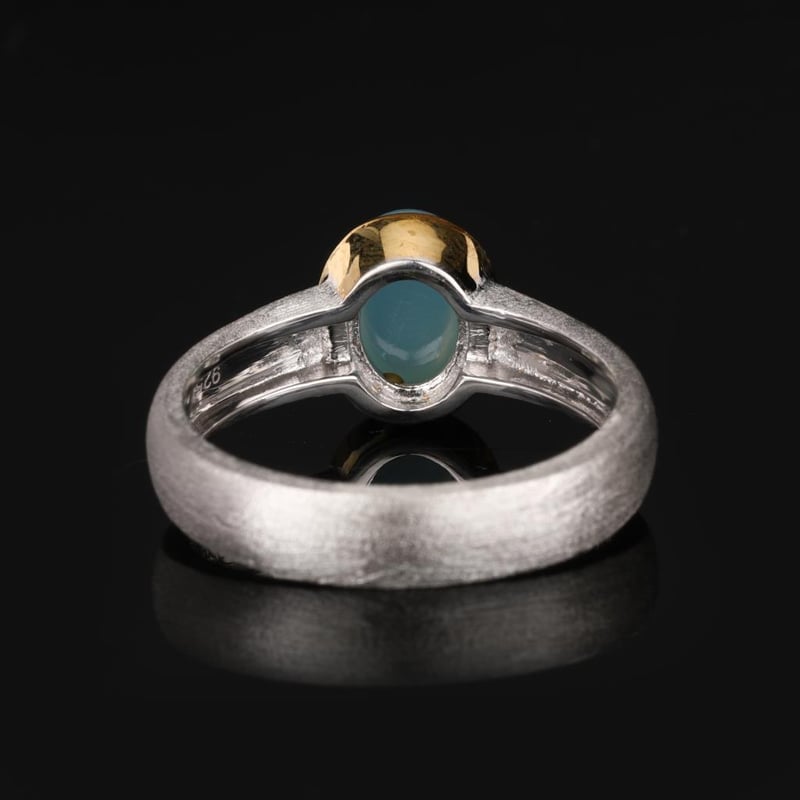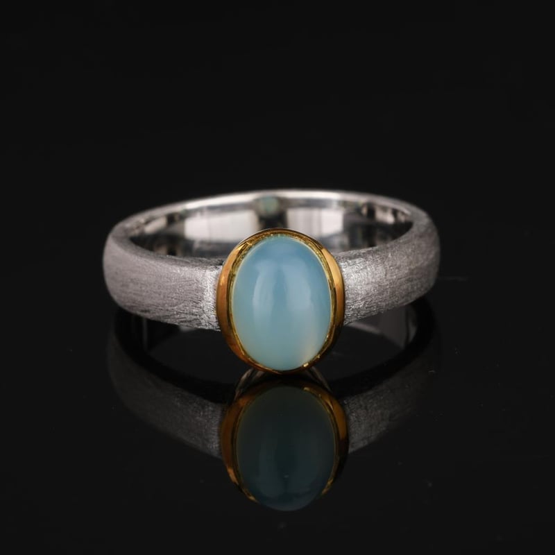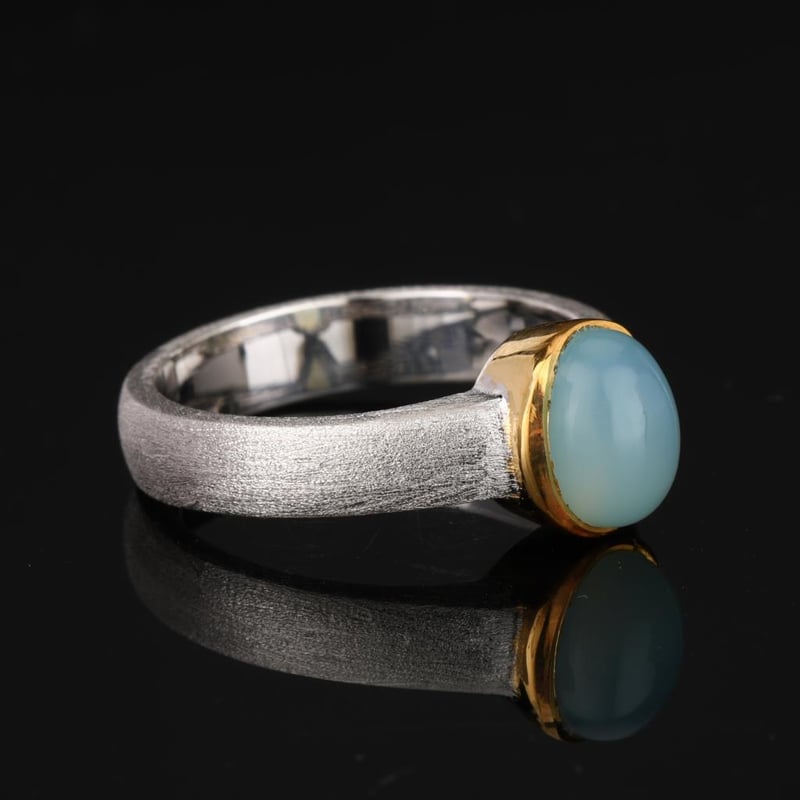 Elegance of the Ocean: Sea Blue Chalcedony RingDive into the serene depths of style with this exquisite Sea Blue Chalcedony ring, a true masterpiece that captures the essence of tranquil waters. The stunning 8x6mm oval cabochon, with its light and airy hue, radiates a calming charm that is reminiscent of sunlit waves lapping against a shore.Crafted with meticulous attention to detail, the collet top area of the ring is beautifully finished in 14K yellow gold plating, adding a touch of luxury that complements the soft brush finish of the band. The polished inside shank ensures a comfortable fit, while the band’s substantial width of 4.50mm and a refined thickness of 1.60mm provide a sense of strength and sophistication.Whether you are dressing up for a grand occasion or adding a touch of elegance to your everyday ensemble, this Sea Blue Chalcedony ring is an impeccable choice. Let it transport you to a world of elegance and tranquility, where every glance at your hand evokes the peace of the ocean's embrace. Indulge in this luxurious piece and make a statement that is both timeless and breathtaking.