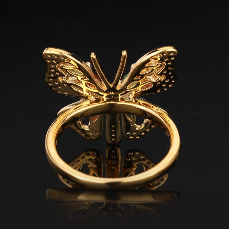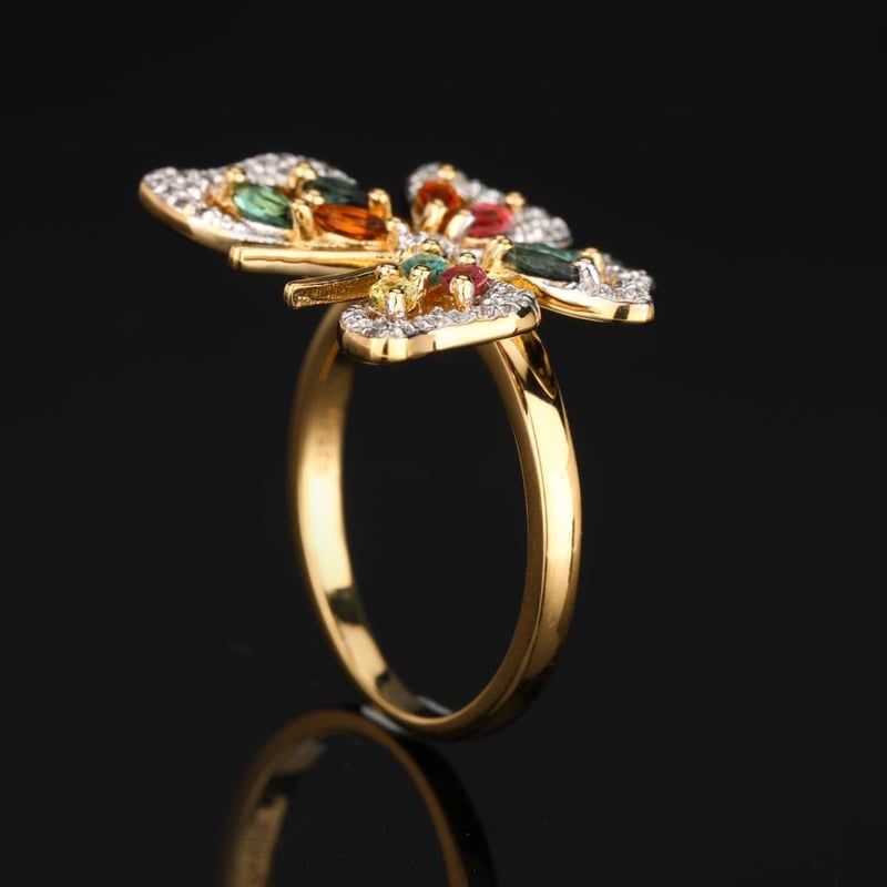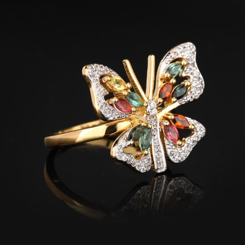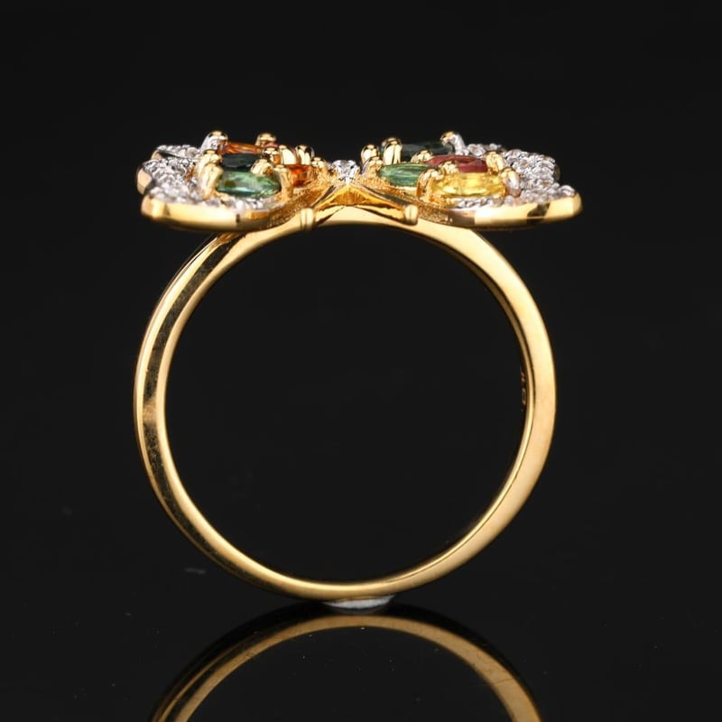 Exquisite Rainbow of Tourmalines and Zircons Butterfly RingIndulge in the kaleidoscopic beauty of nature with this breathtaking Butterfly Ring, a masterful blend of vibrant tourmalines and sparkling zircons that dances delicately upon your finger. Crafted with precision and passion, this enchanting piece features an array of stunning gemstones, each selected for their unique hues and brilliance.Adorning the ring are two marquise-cut blue tourmalines, their celestial tones reminiscent of tranquil ocean waters. These are complemented by three marquise-cut green tourmalines, evoking the lush verdancy of a sunlit forest, and two marquise-cut pink tourmalines that radiate a romantic blush, capturing the essence of a blooming rose garden. The vivid orange and yellow tourmalines add an electrifying pop of color, illuminating the design with their warm, sun-kissed glow.Nestled among these stunning tourmalines are 66 natural white zircons, meticulously placed to enhance the ring’s elegance. The round zircons—58 measuring 1.00mm and 8 measuring 0.80mm—sparkle with a brilliance that rivals diamonds, creating a breathtaking halo effect that accentuates the vibrant colors of the tourmalines.Crafted in white pen rhodium, this ring not only showcases the vivid gemstones but also ensures durability and a luxurious shine. The design, inspired by the delicate grace of a butterfly, symbolizes transformation and beauty, making it a perfect gift for someone special or a remarkable addition to your own jewelry collection.Let this enchanting Butterfly Ring carry you away into a realm of color and light, where every glance sparks joy and admiration. Bid now to own a piece of nature’s artistry, expertly translated into a luxurious adornment that will elevate any ensemble.