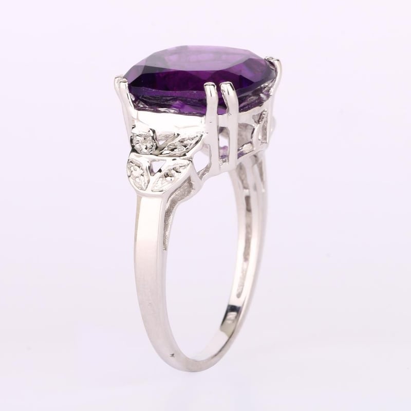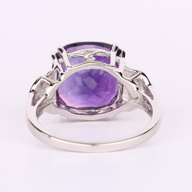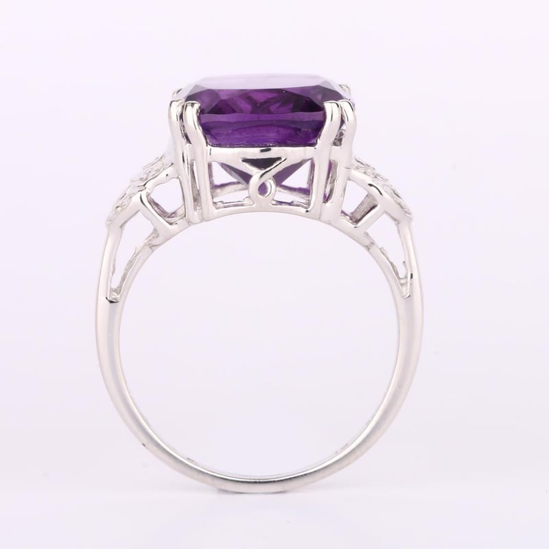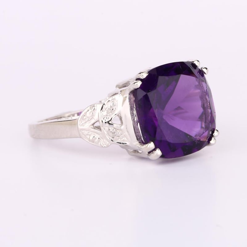 Radiant Elegance: African Amethyst Cushion Ring with White Diamond AccentsStep into a realm of sophistication with this exquisite ring featuring a captivating African Amethyst cushion, measuring a generous 12.00mm. This stunning gemstone, renowned for its deep, regal purple hue, is the centerpiece of the design, exuding an air of luxury and timeless grace. Surrounding the amethyst are four sparkling round white diamonds, each 1.00mm in size, meticulously set to enhance the brilliance of the central stone. These diamonds catch the light beautifully, creating a dazzling contrast that elevates the overall allure of the piece. Crafted with precision and an eye for detail, this ring is not just a piece of jewelry; it's a statement of style and elegance. Whether worn for a special occasion or as an everyday adornment, this ring is sure to turn heads and capture hearts. Embrace the beauty of this enchanting combination of amethyst and diamonds, and let your inner radiance shine through.